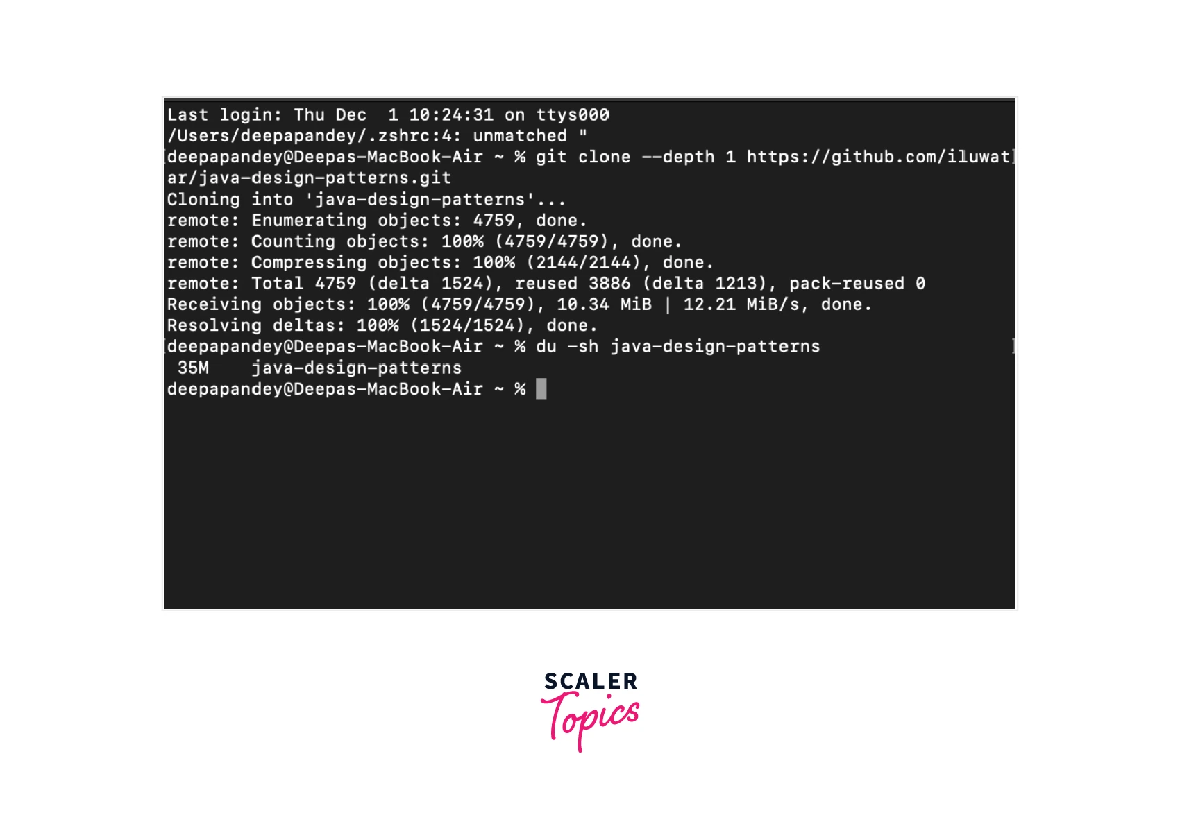 Let us look at an example where we will be cloning a Java-design-patterns repository in the usual way, and also in a shallow clone way to get a clear understanding of the difference in size in both cases.