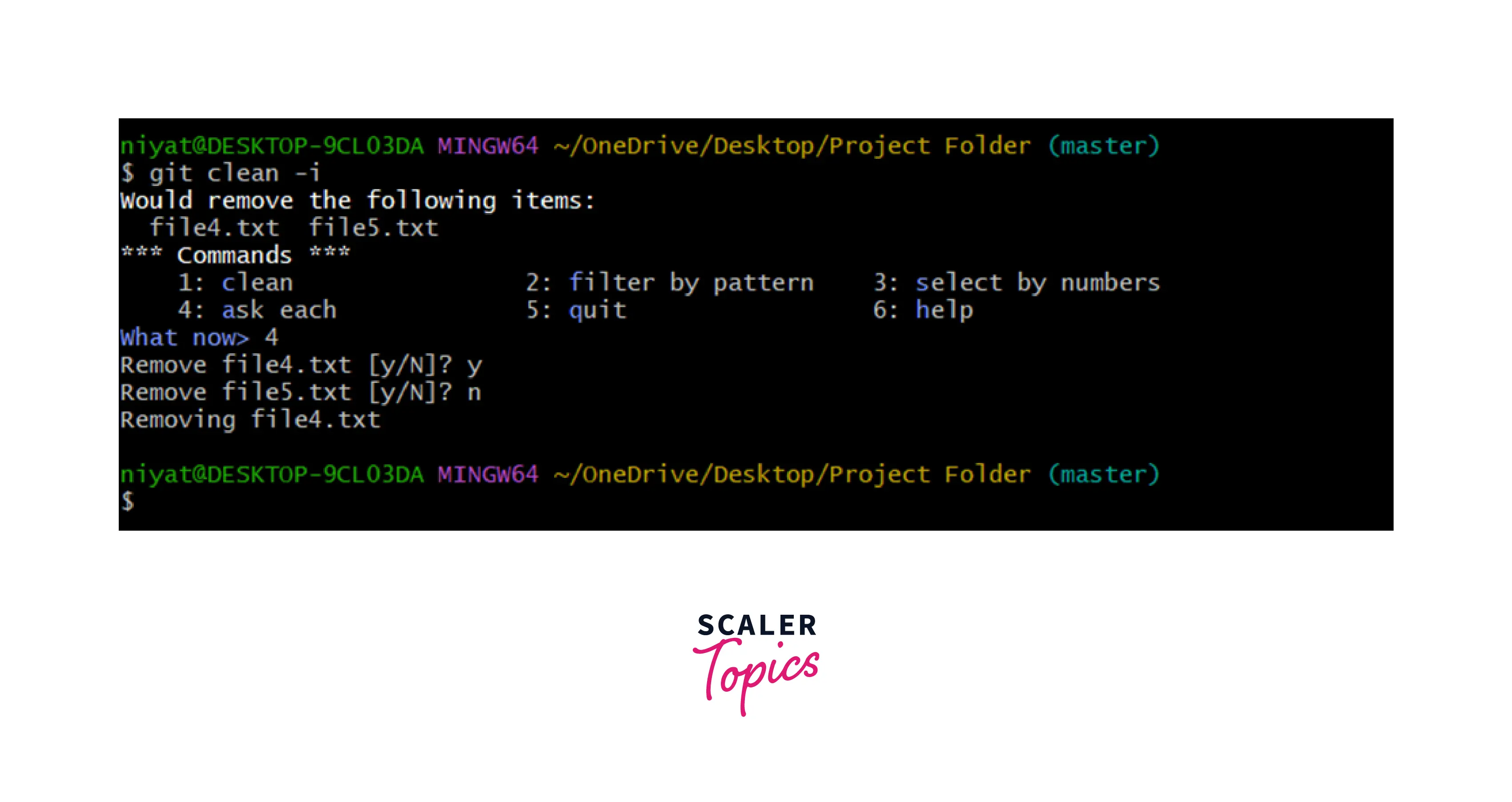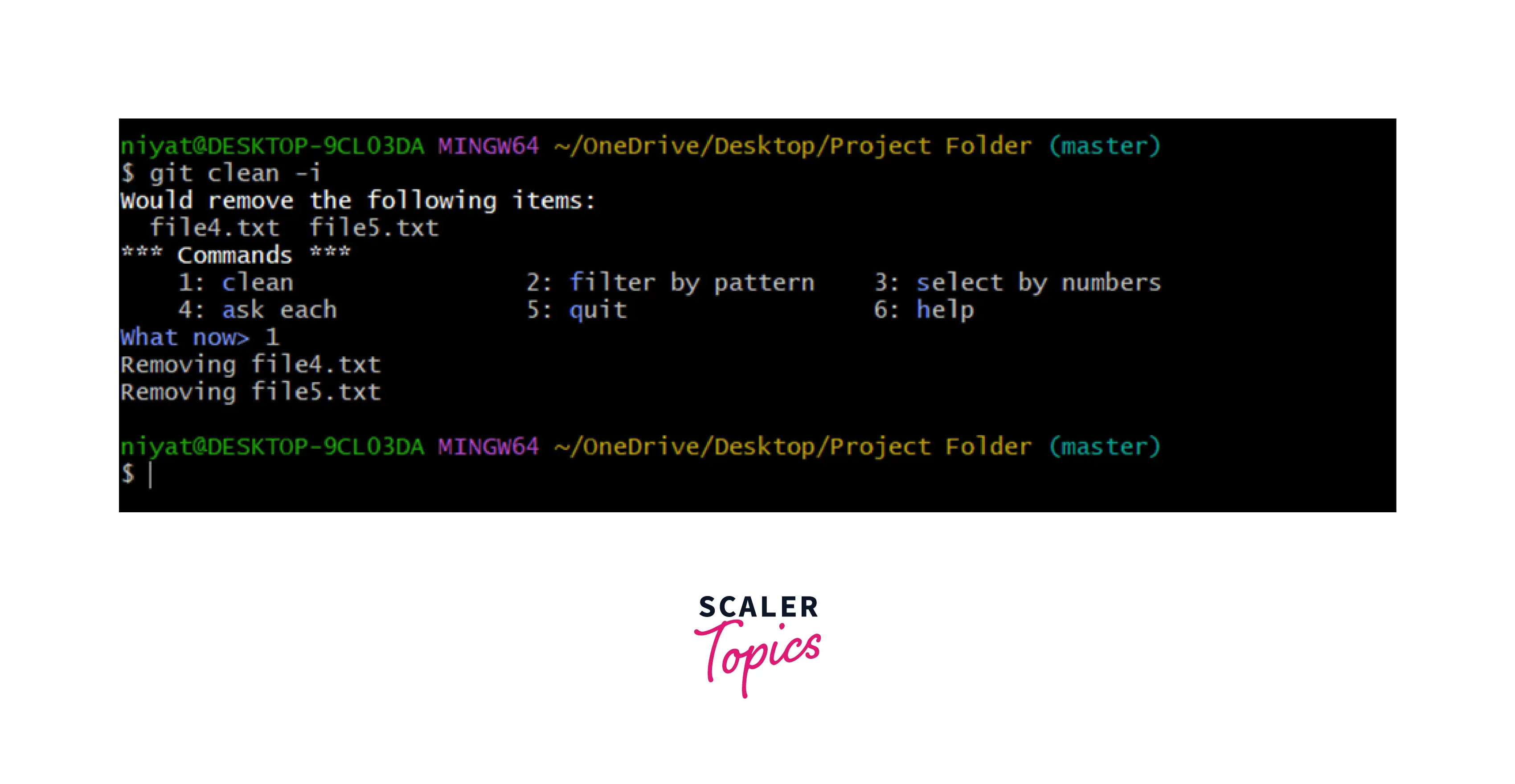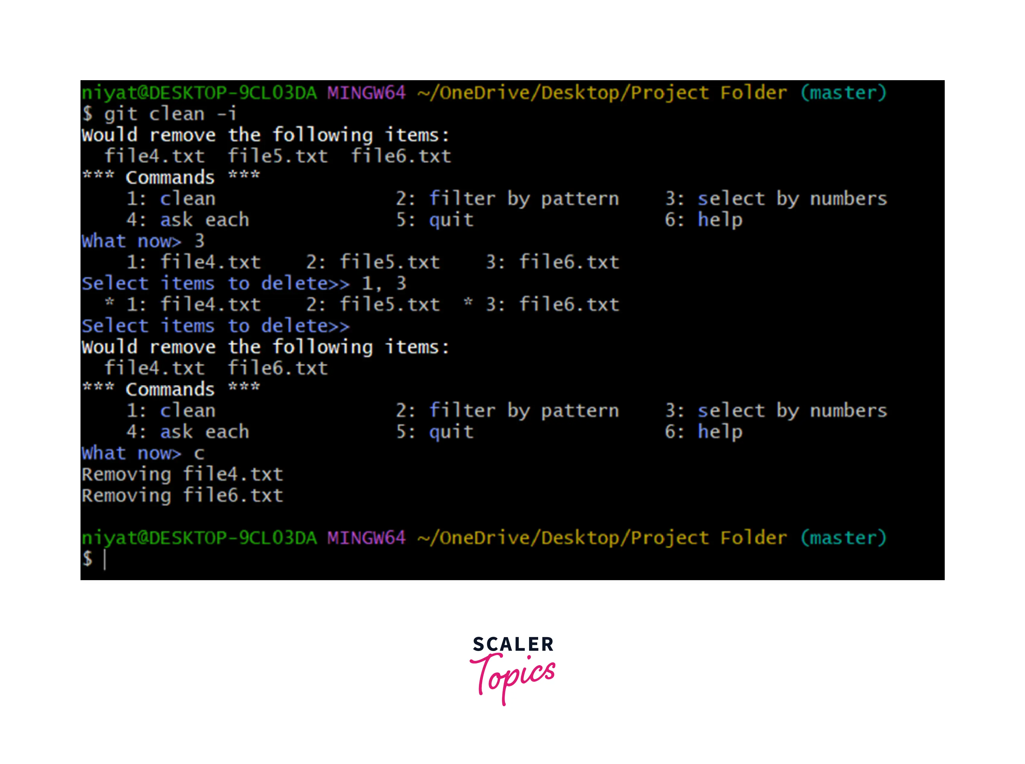It removes all the ignored files at once. The files that are specified in the .gitignore are removed from the repository. To remove specific files only we may use the -i option to filter or to choose using index numbers.