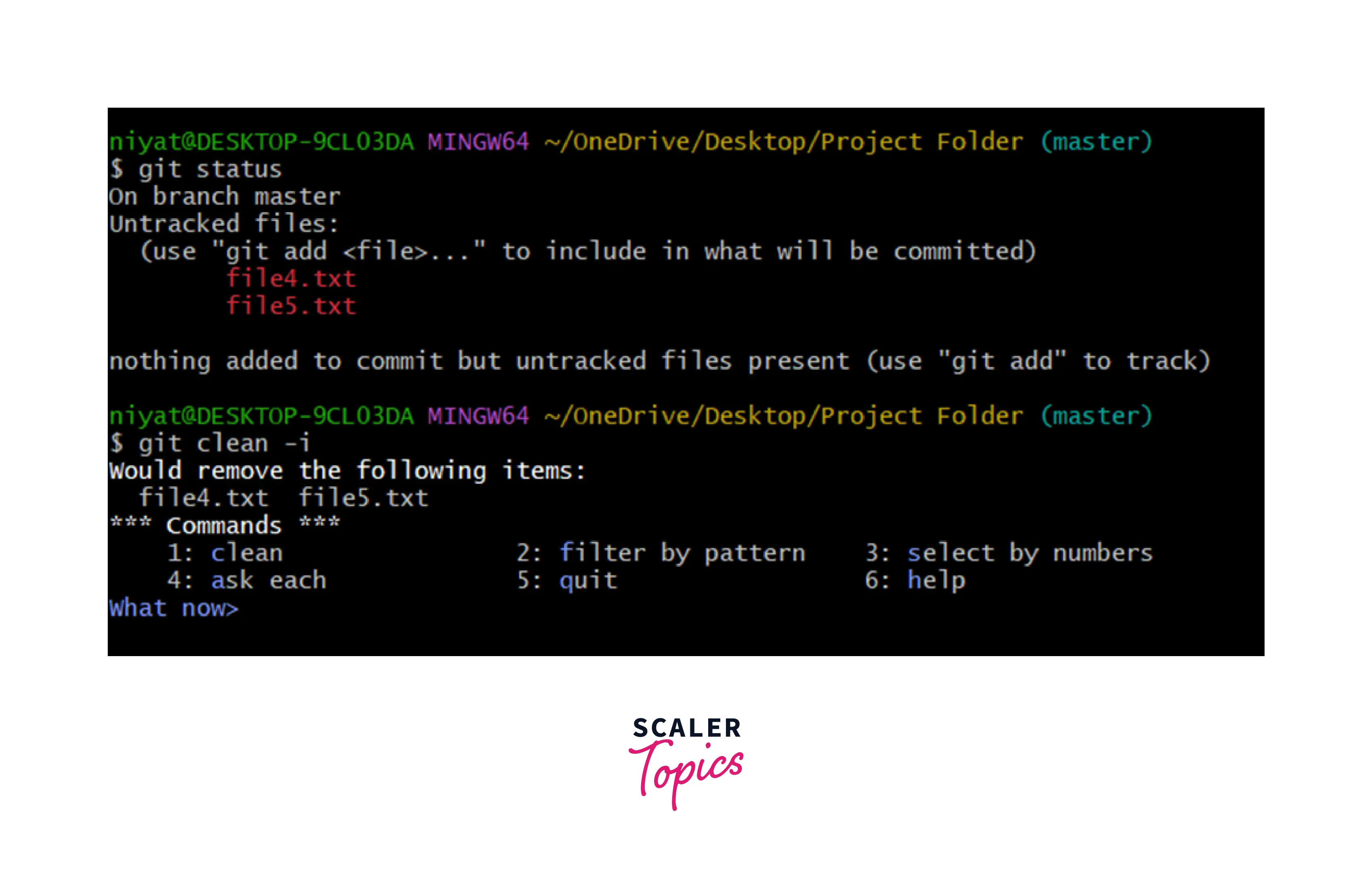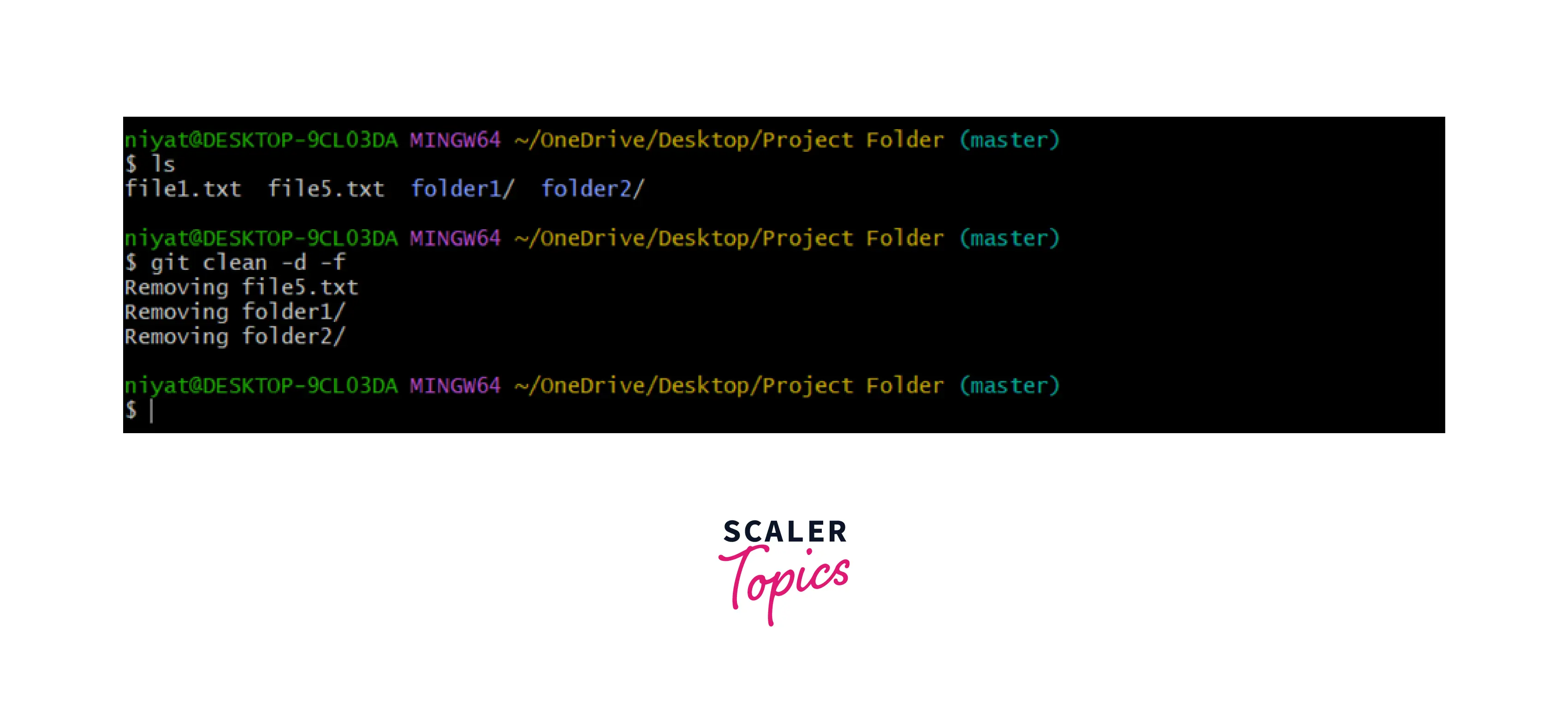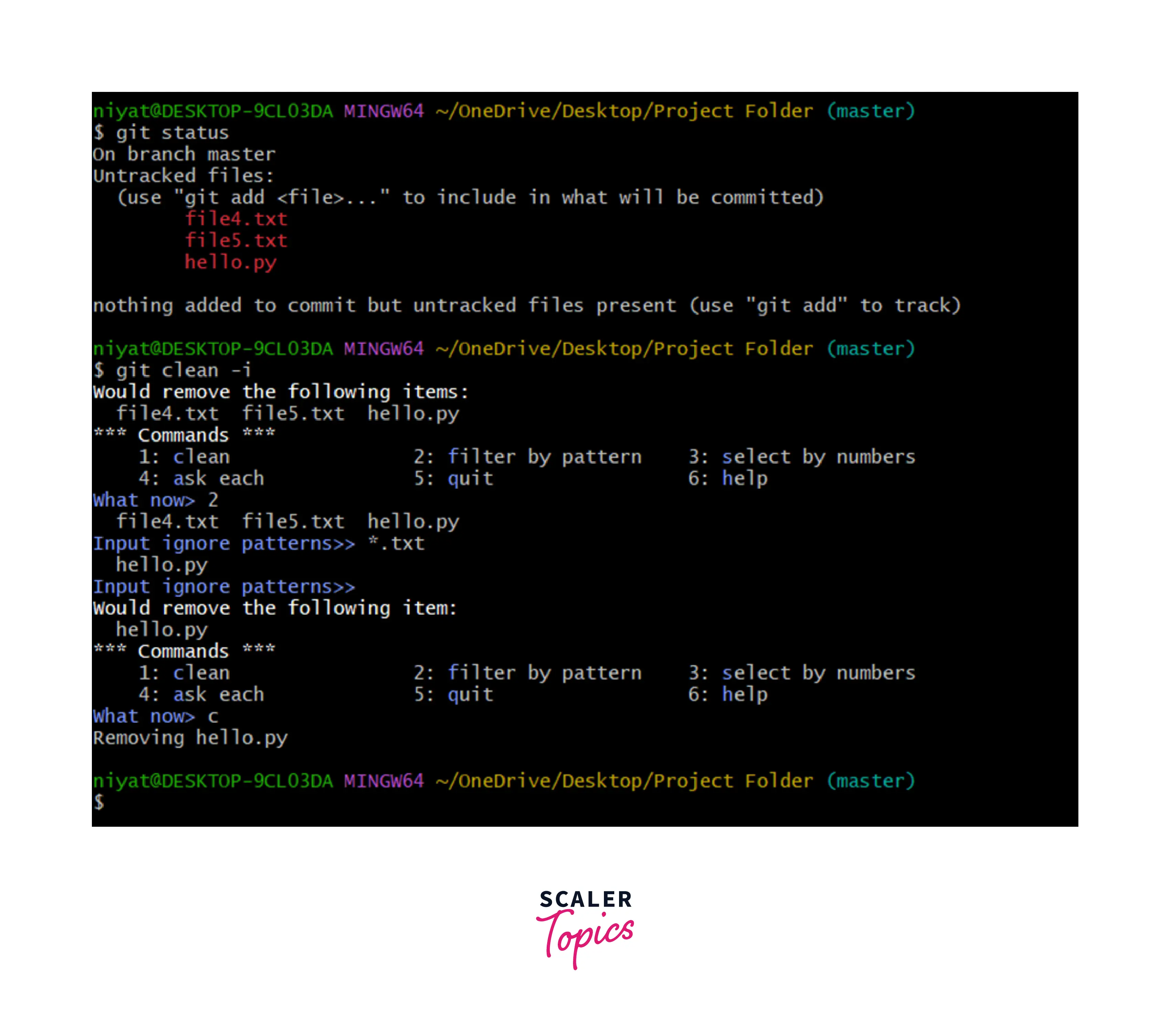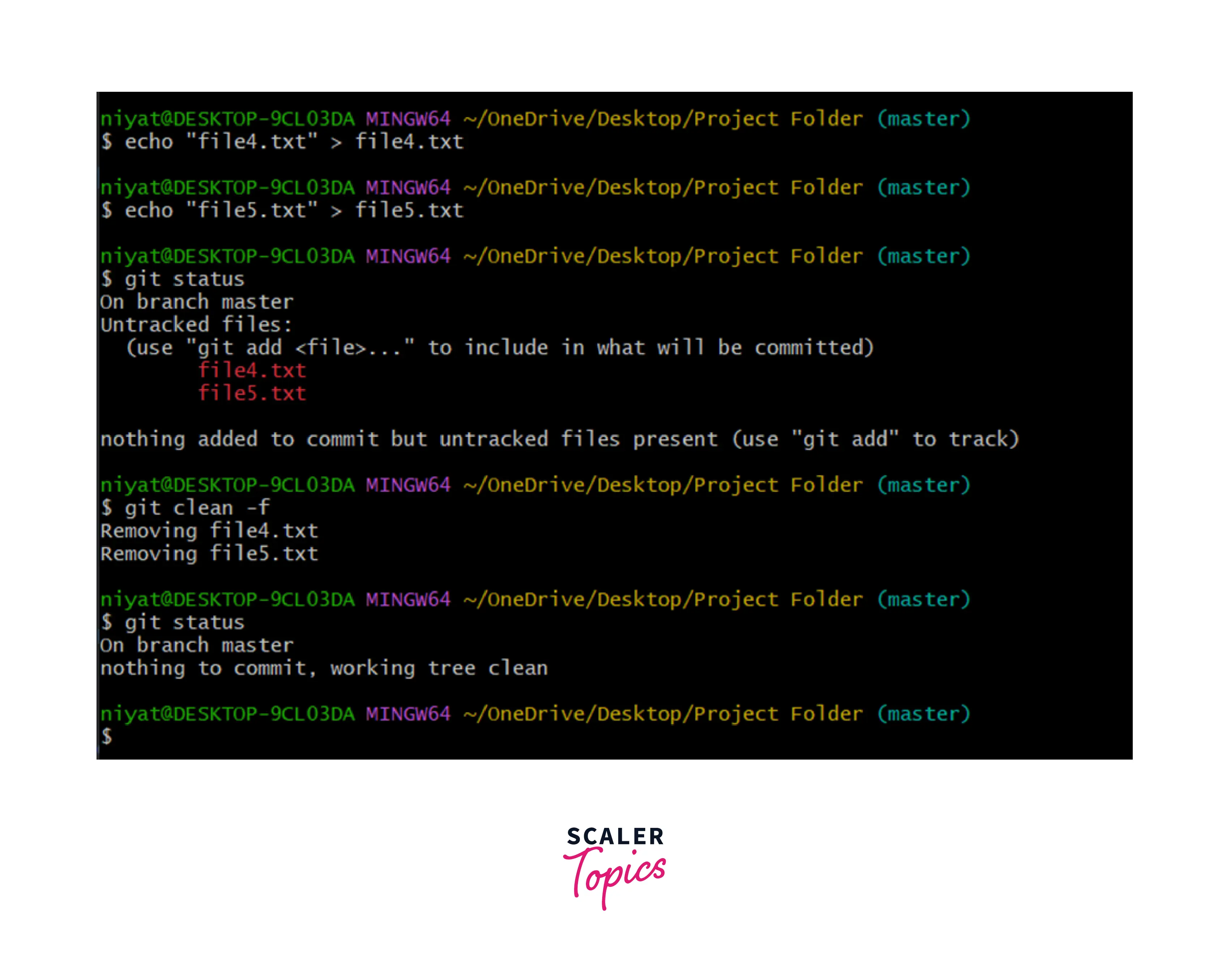 Have a look at the example below, we are adding two files to the repository. These files are yet untracked and on performing git clean -f both the files are deleted and are no more shown as untracked files.