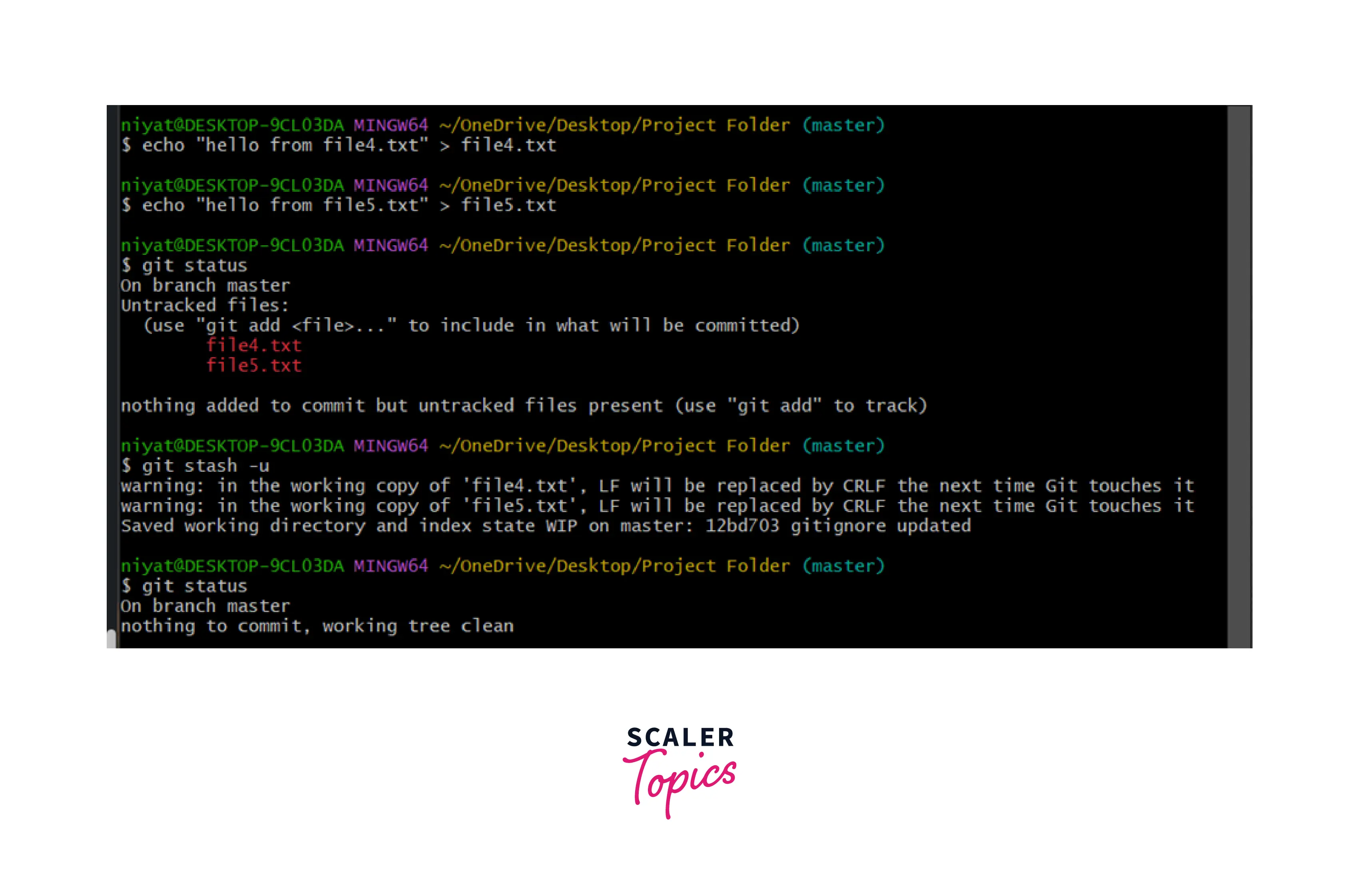 An example of git stash is given below. The git stash -u command adds all the untracked files into the stash. To restore the file git stash pop can be used. To restore all files git stash popstash@{x} command is used.