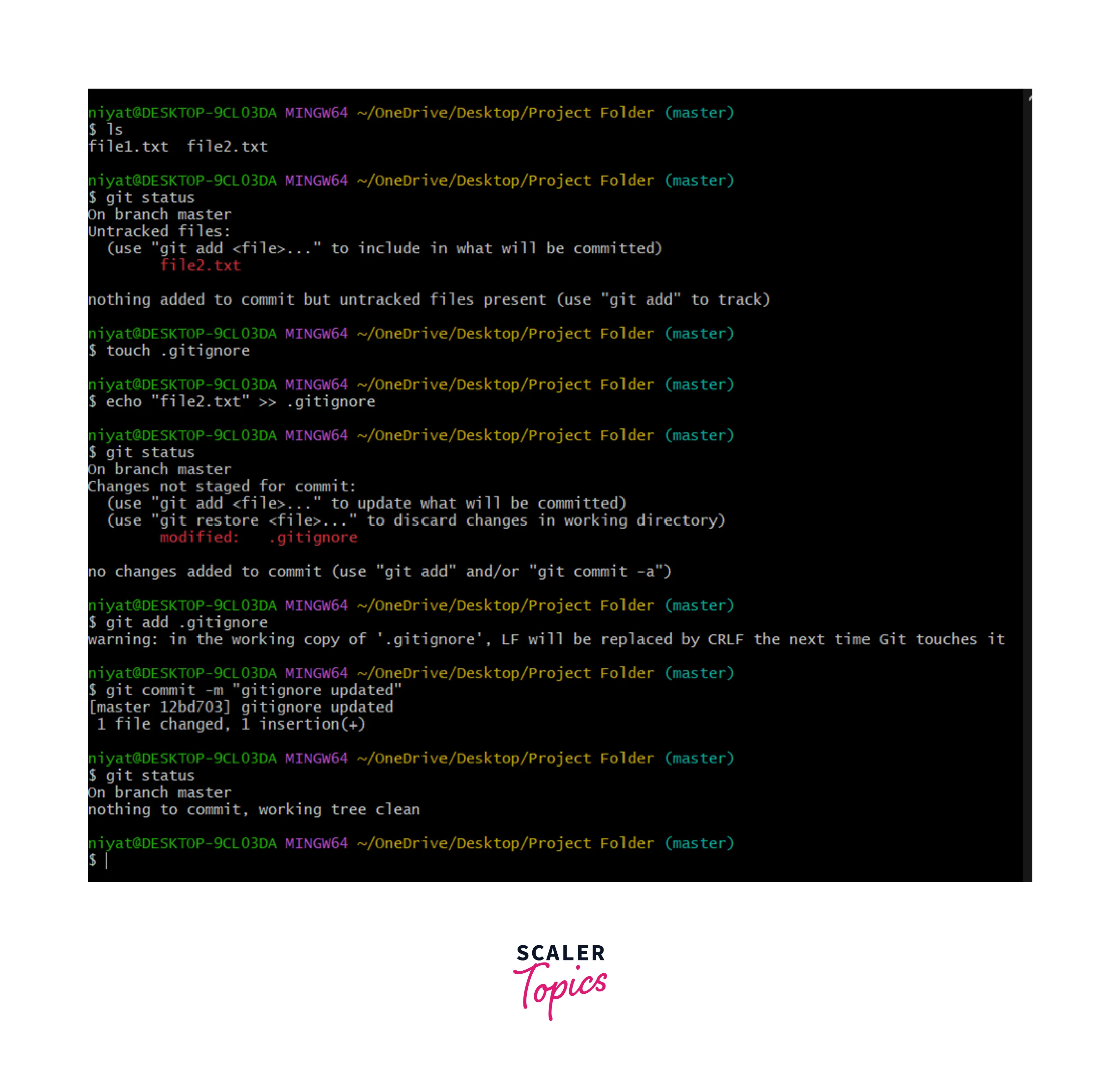 On executing the git status command we see that file2.txt is untracked. We append the file name into the .gitignore file using the echo command and >> to append. In the next status execution, we see that the .gitignore command is untracked as we modified it and its changes are not tracked or saved by Git. But file2.txt is removed from this list. As soon as we commit changes in the .gitignore file, Git shows no untracked files.