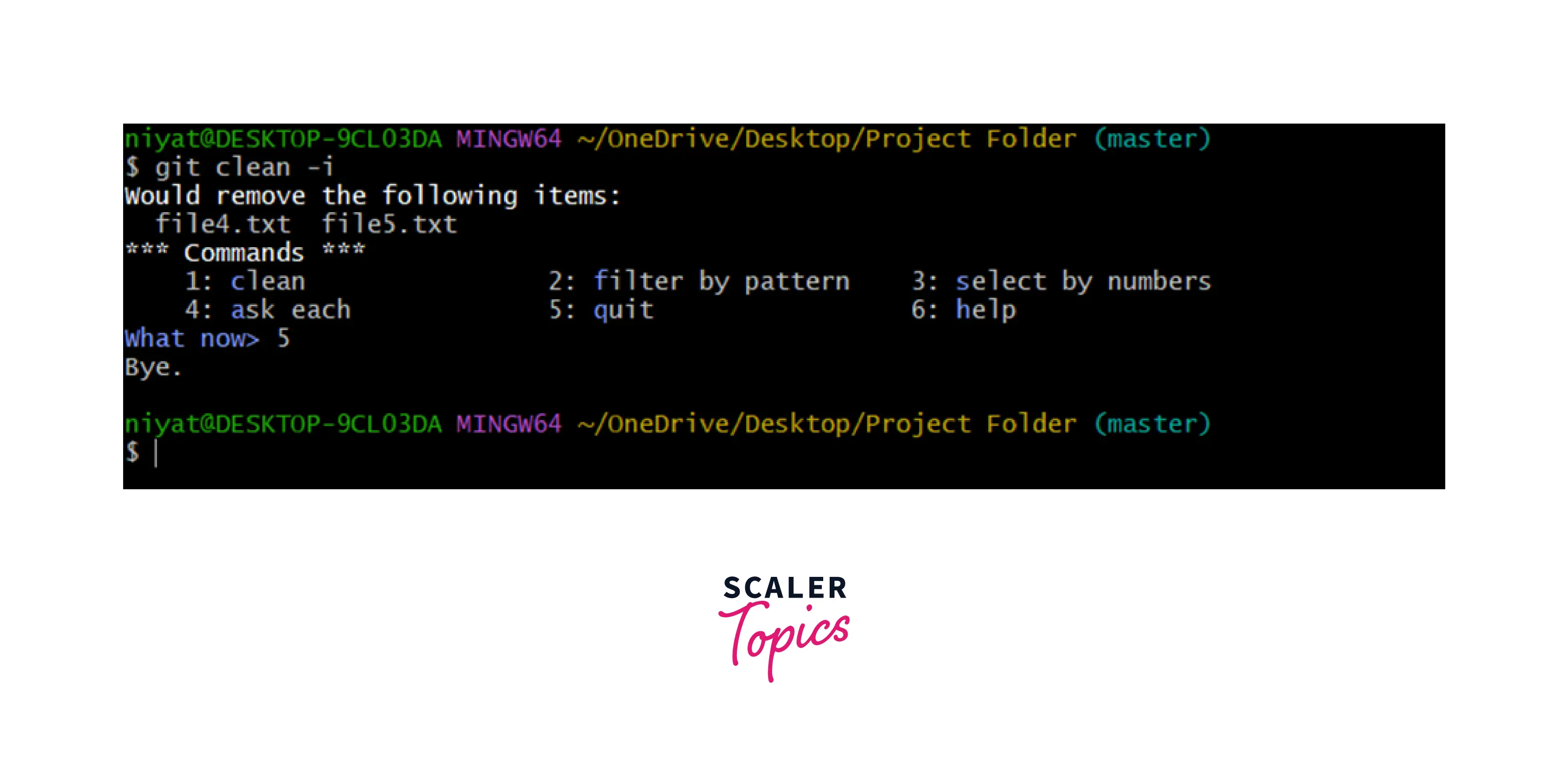 - Filter by Pattern - This option allows you to enter patterns using which Git filters files. We can apply multiple filters to separate desired files, simply press enter when done filtering. This will again show the menu, press c to remove selected files and q to exit. We can also use numbers i.e. 1 to remove files and 5 to quit without removing anything.