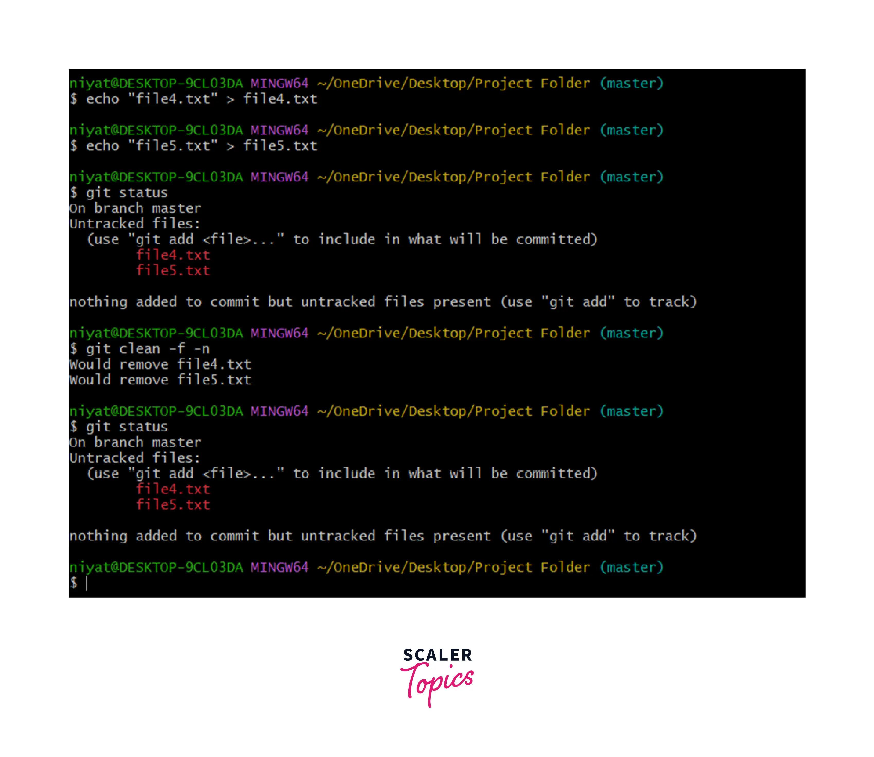 Let us now explore each of the options available with the git clean command with an example. We will begin by adding untracked files to our repository using the echo command or manually creating and adding files to the project folder.