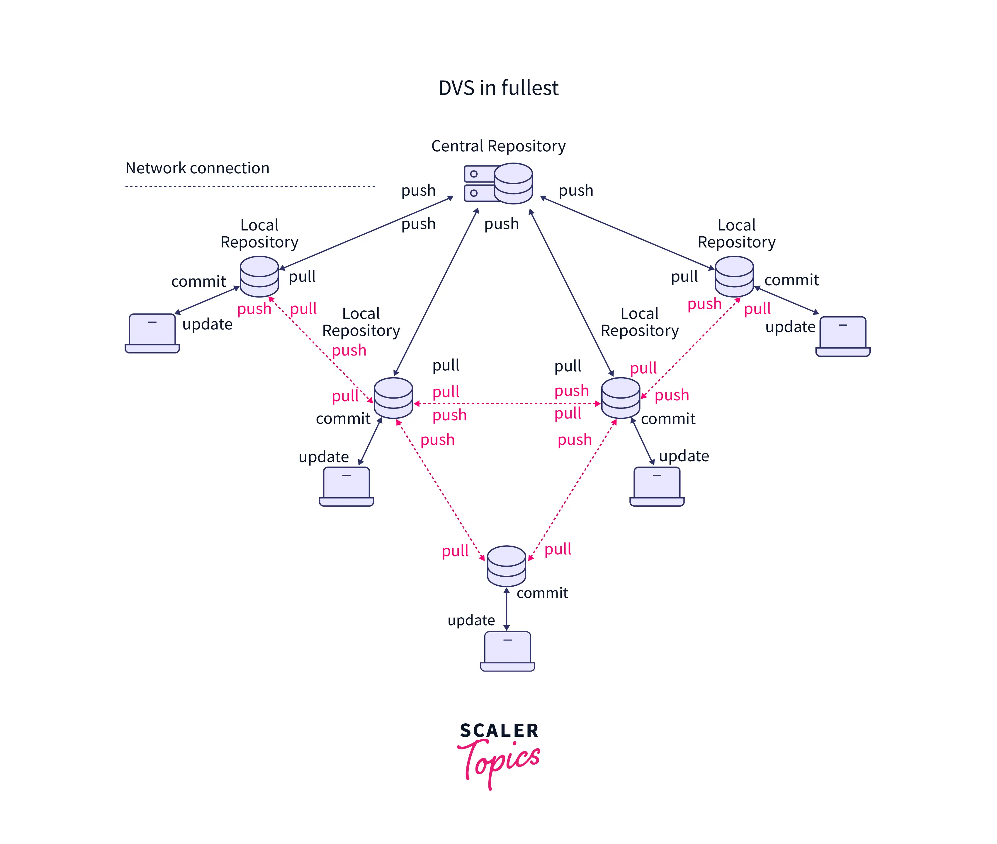 The term Distributed Version Control System is also self-explanatory. In Distributed VCS, there is a central repository, and developers can also have that whole repository in their local system. Hence, for any change, firstly, the developers make the change in the local repository and test it; then, if the team decides to make it live, it is committed to the central repository.