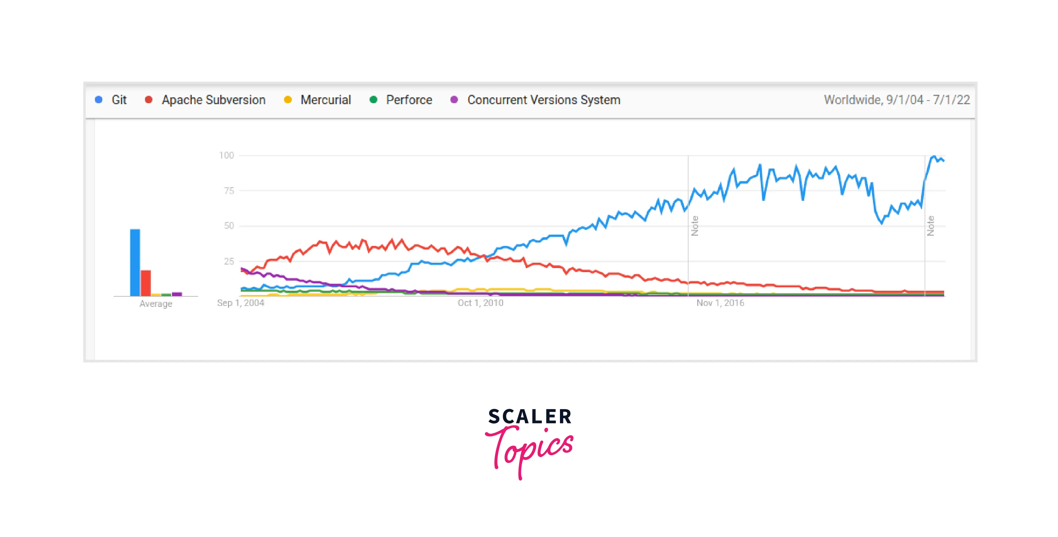 There are many distributed Version Control Systems in the market, but here we will see the two most popular. As per the Google Trends report, one of them is way more popular than the others.