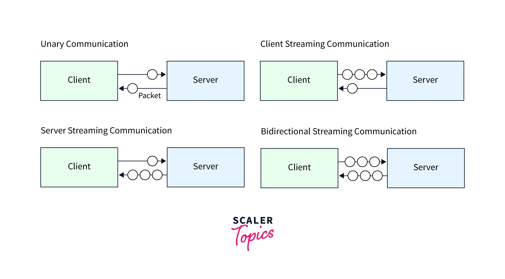 Till now we have only used the unary Golang GRPC for communication which means a single request is sent to the server and a single response is received back. The Golang GRPC also has 3 types of streaming protocols namely, client streaming, server streaming, as well as bidirectional streaming. Here each streaming executes well for large amounts of data.