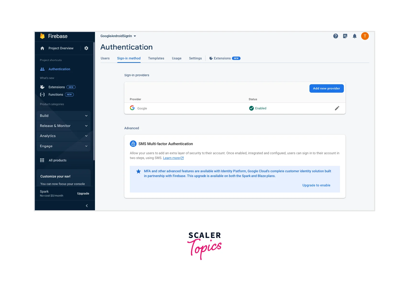 - Go to the build tab along the side, on clicking it open the authentication panel and then enable google sign-in.