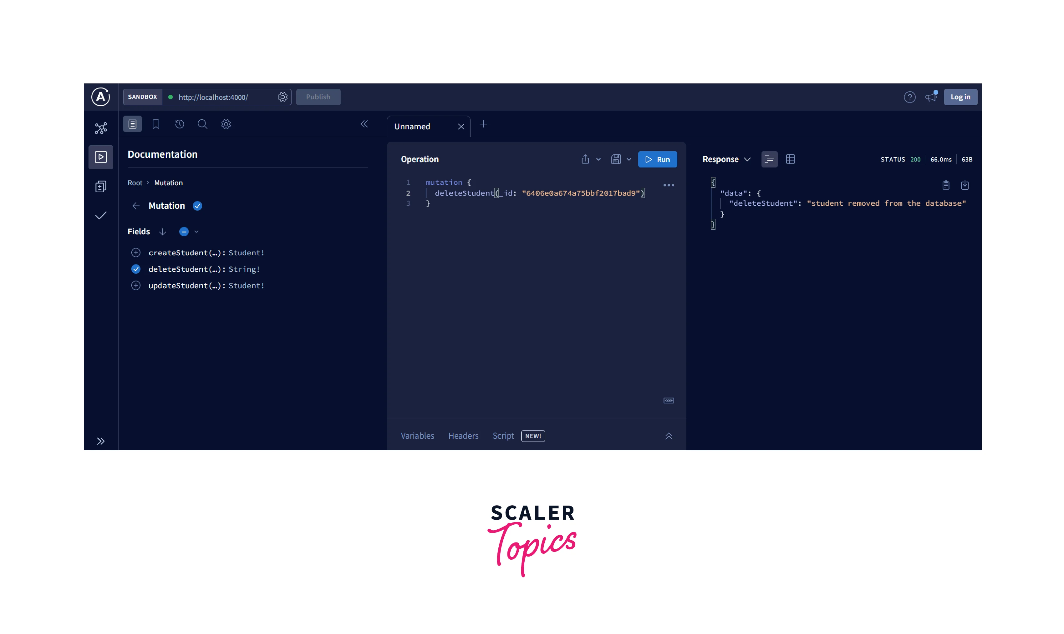 The mutation returns the deleted student record's _id, name, dept, year, and cgpa fields, according to the selection set. If the record has already been deleted, the response for all fields will be null.