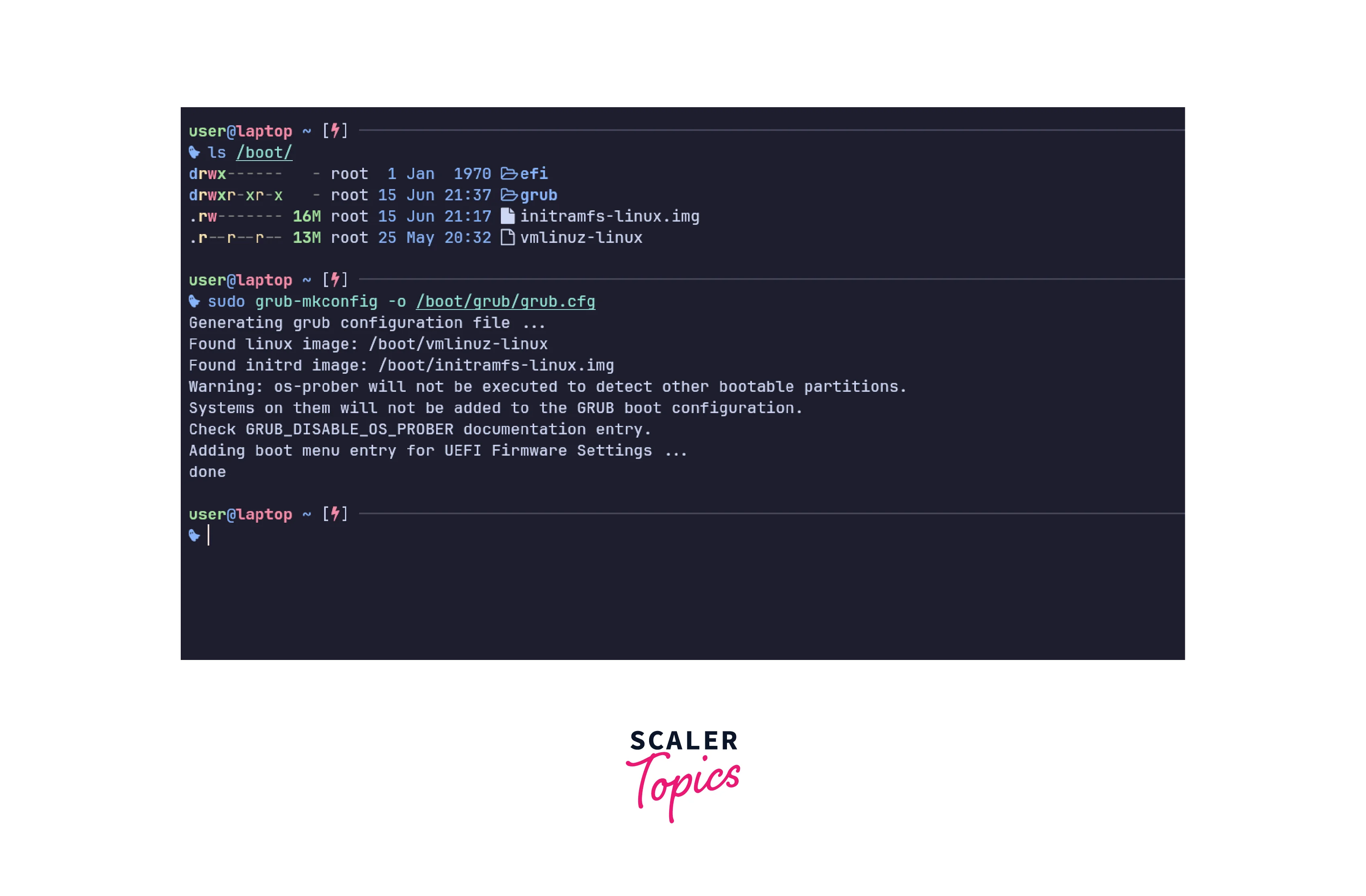 But to change any configuration in GRUB, the user needs to edit the file at /etc/default/grub. Whenever a user makes configuration changes in this file, they need to re-create the GRUB's configuration present in /boot/grub/grub.cfg by running the command: