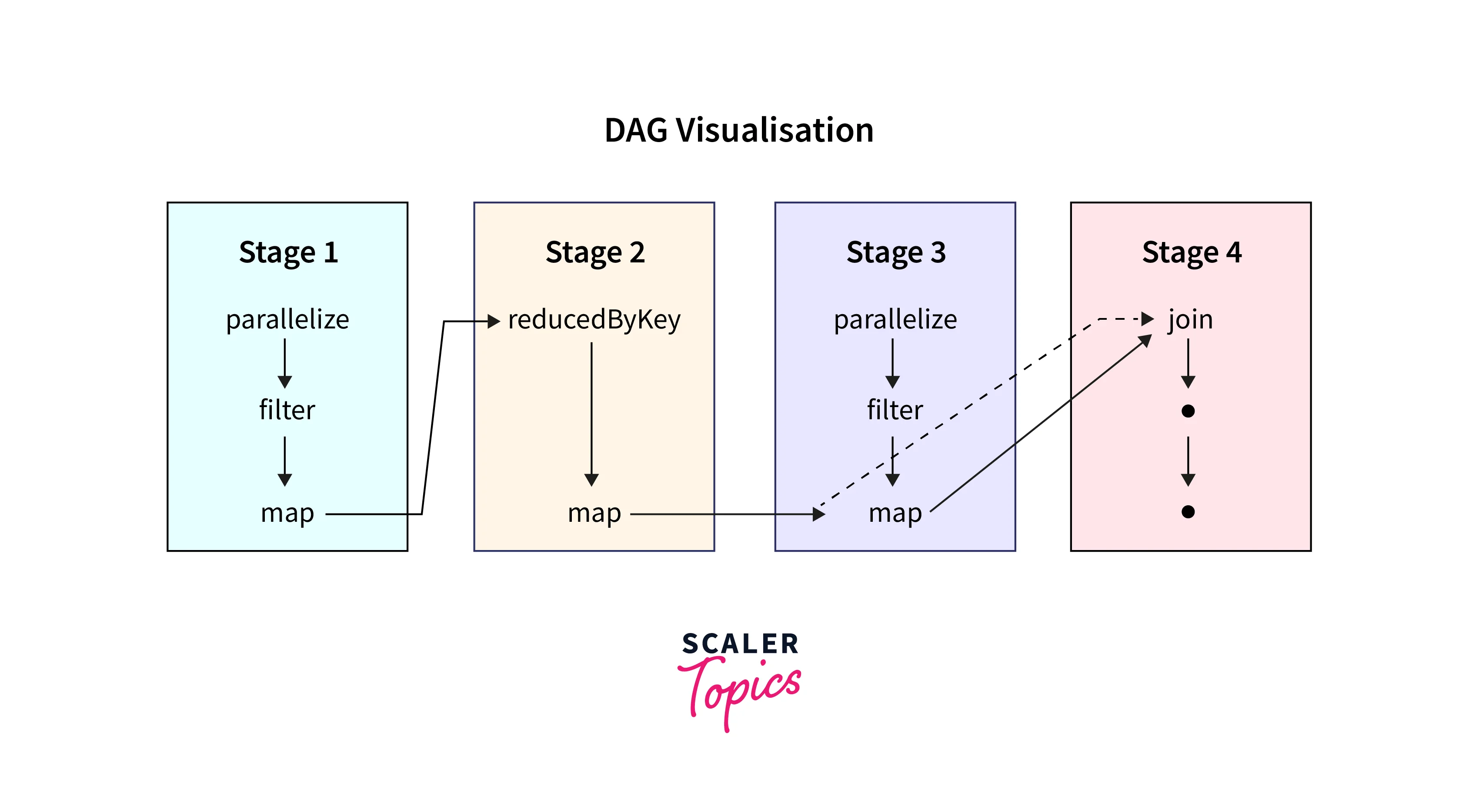 Directed Acyclic Graph(DAG), is a powerful tool in Apache Spark which is used to break down computing jobs into smaller, more manageable pieces. A DAG is similar to a graph data structure in which each node represents an operation or a stage, and the edges between the nodes represent the dependencies between those stages. By understanding the dependencies between different stages, Spark can optimize the scheduling of tasks and avoid unnecessary computation, leading to faster and more efficient data processing. DAG keeps a record of failed tasks and helps to recover from failures by re-executing only the failed tasks.