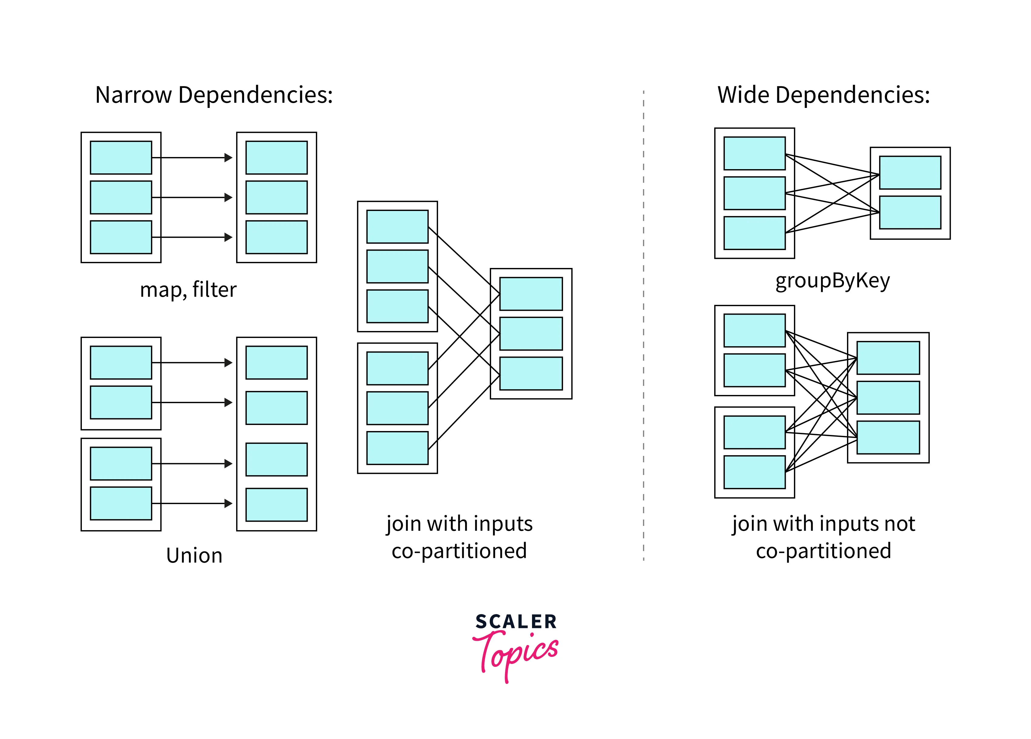 Note: Dependencies in RDD are the relationship between different RDDs. The dependencies are classified based on whether the partition of a parent RDD is being used by single or multiple partitions of a child into narrow or wide and these dependencies are used to create DAG.