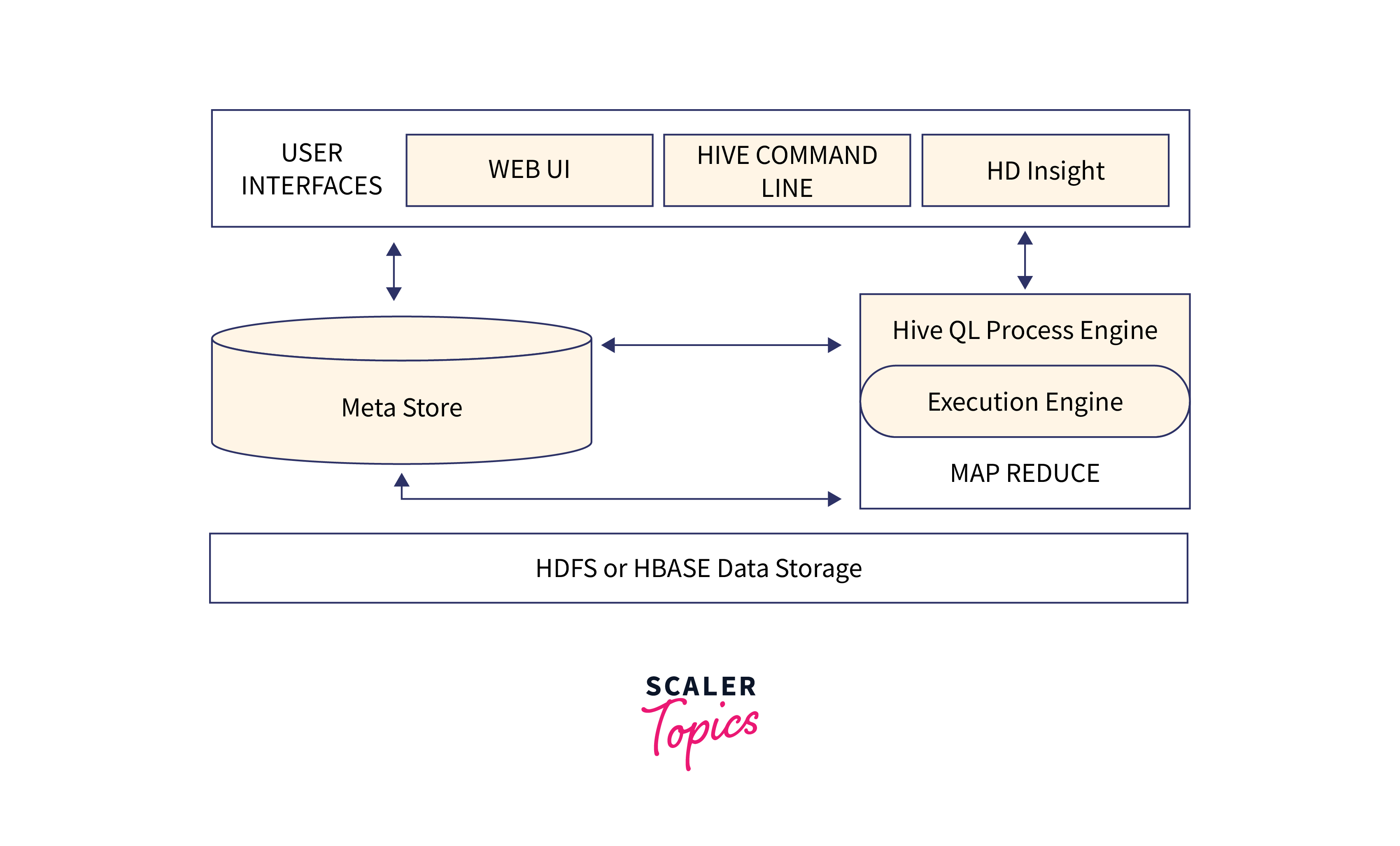 | Metastore | The Metastore is a centralized location where Hive's data's metadata, including details on tables, partitions, columns, storage formats, and other related topics, are kept. It offers management and retrieval services for the metadata and saves it in a database (such as MySQL or PostgreSQL). |