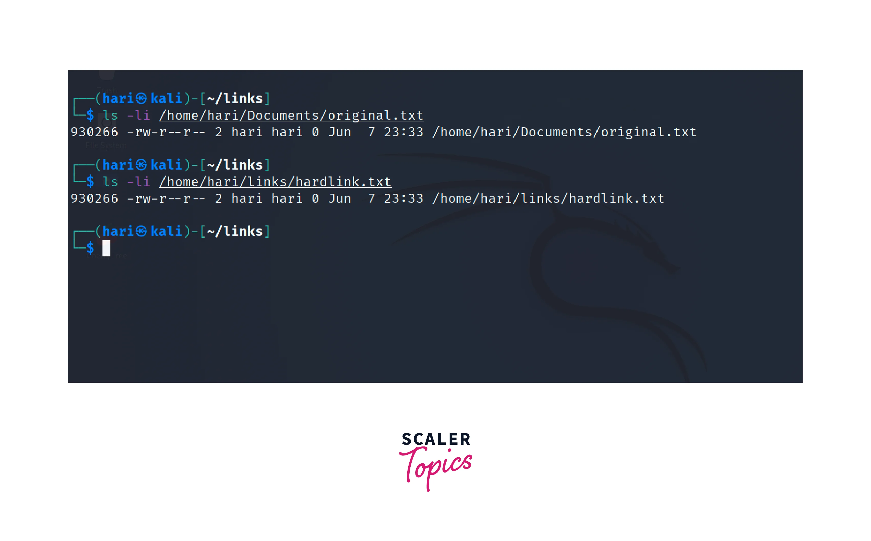 After running this command, a hard link with the name hardlink.txt will be created in the /home/hari/links/ directory. The hard link and the original file will share the same inode, meaning they point to the same data.