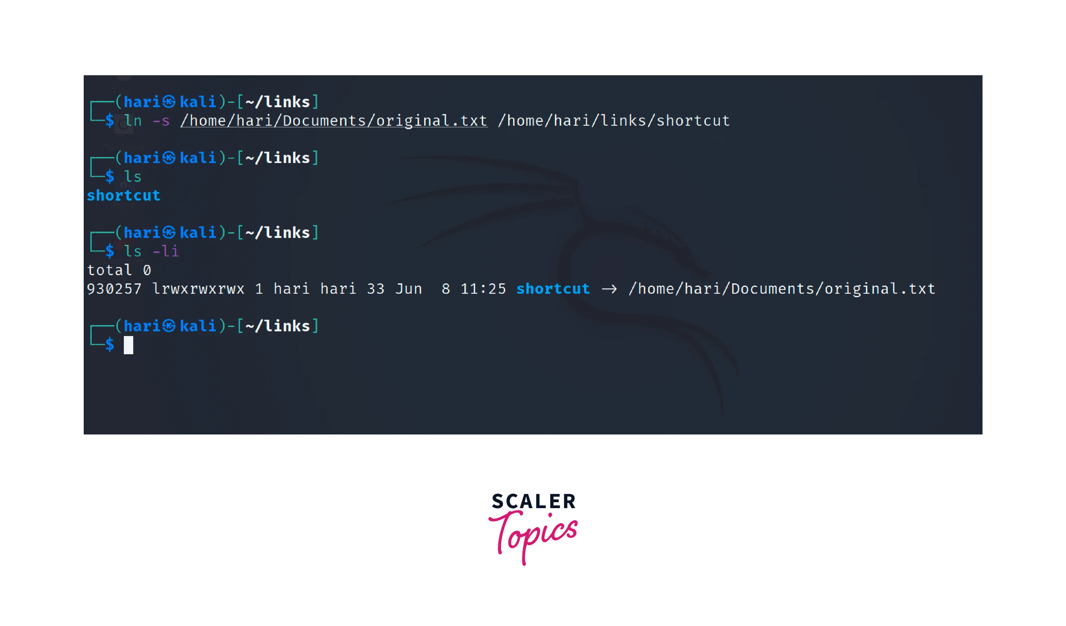 After executing the above command, the soft link shortcut will be created in the /home/hari/links directory and will act as a shortcut to the original file original.txt.