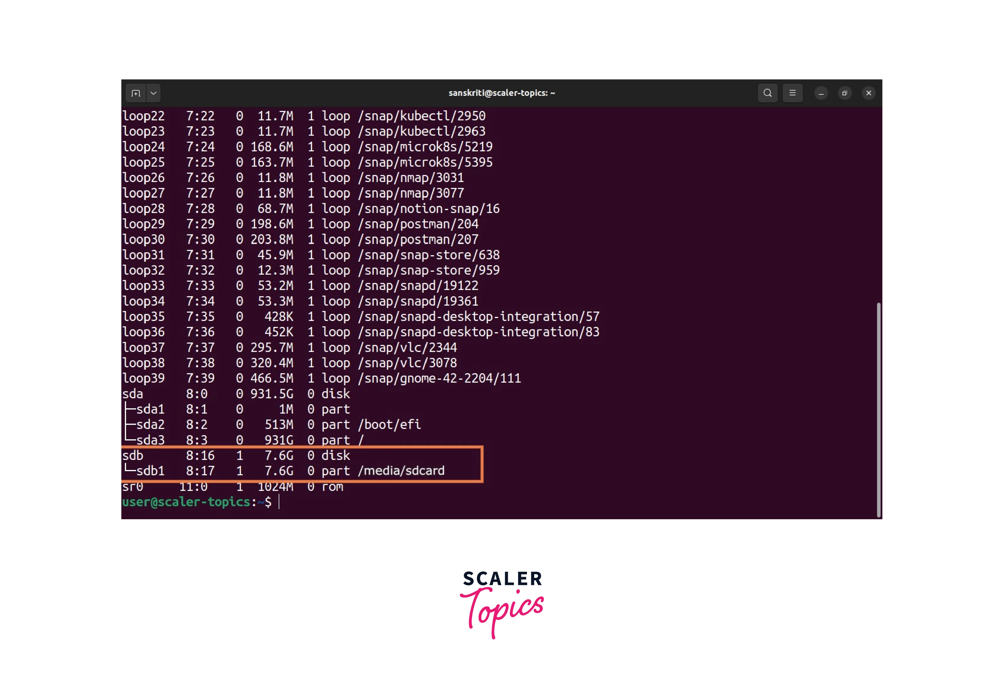It will display a table-like structure showing the available block devices, sizes, and mount points. Look for the entry representing your SD card, usually identified as a device like /dev/sdX (where the letter "X" corresponds to your SD card).