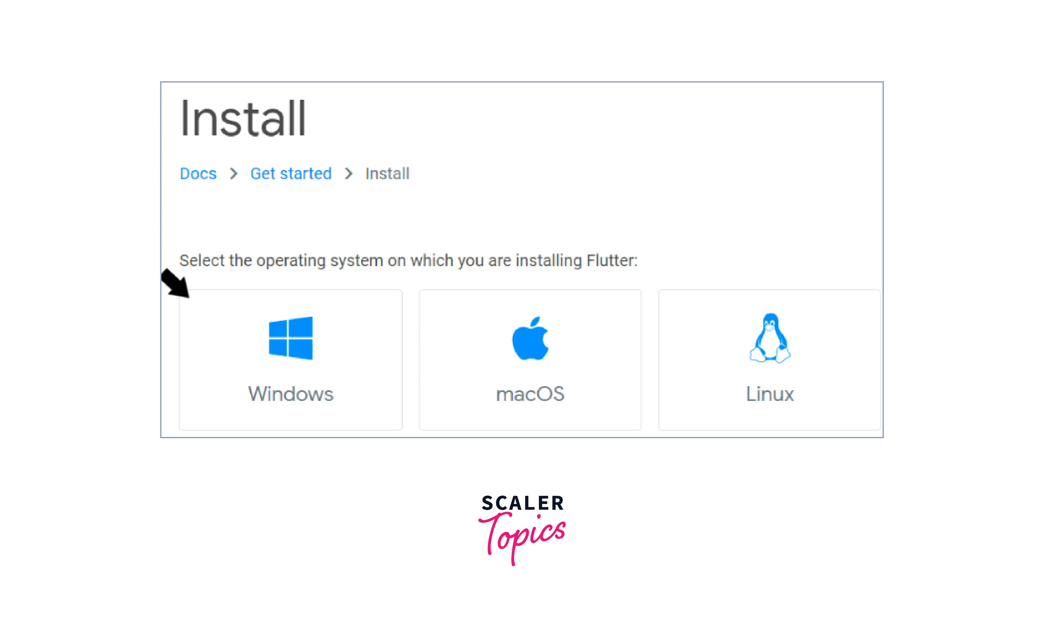 Go to flutter.dev on your website. Select Docs > Get Started > Install > Windows from the top navigation bar.