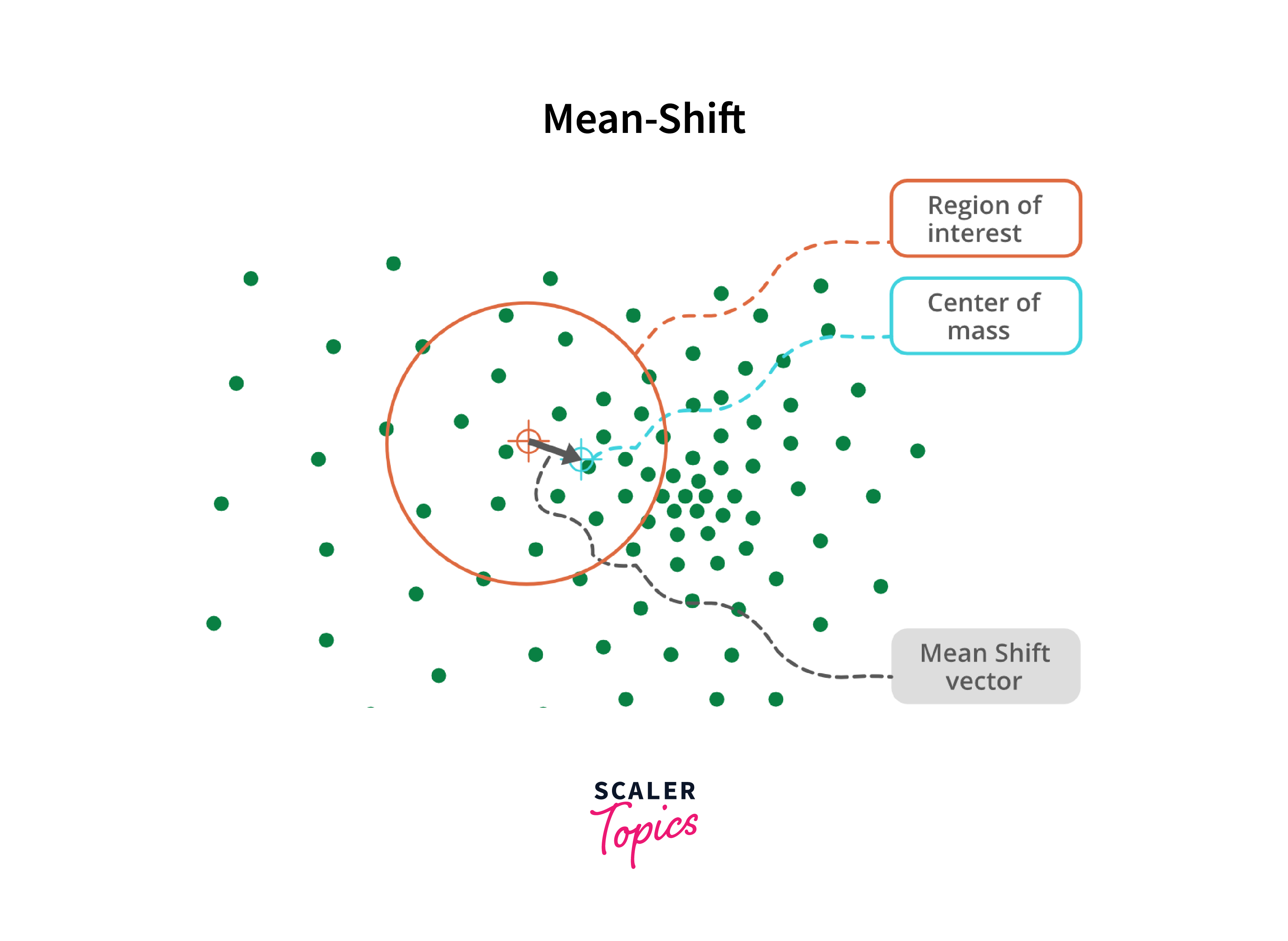 Mean Shift Clustering Mean Shift Clustering is a more advanced clustering algorithm in image segmentation that does not require a pre-specified number of clusters like k-means. Instead, it works by iteratively shifting each data point towards a higher density region in feature space until it converges to a mode or local maxima of the probability density function. This is achieved by applying a kernel function to each data point to estimate its density and then shifting it towards the weighted mean of all nearby data points within a certain radius or bandwidth.