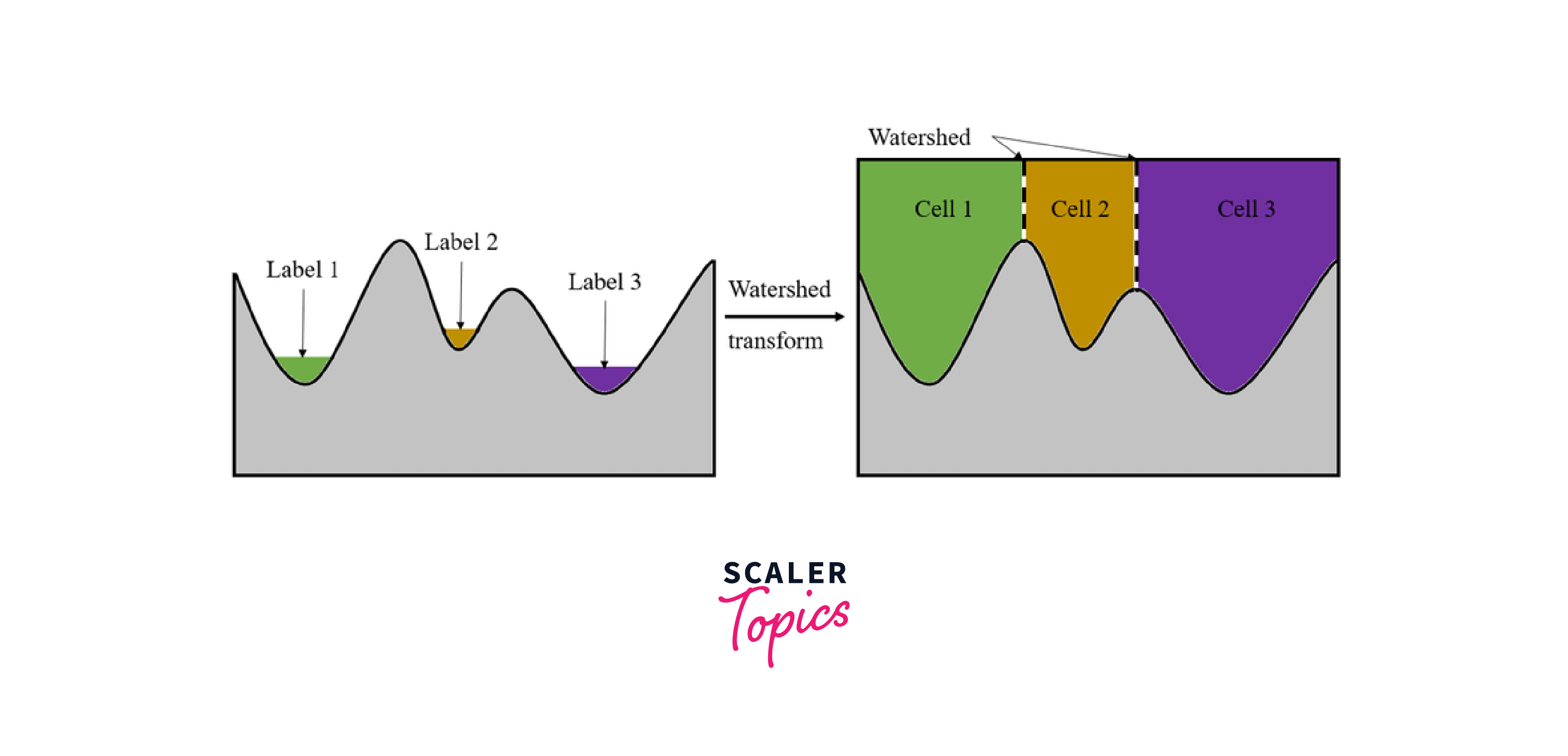 The algorithm then partitions the image into catchment basins, where each basin represents a different region. The boundaries between regions are defined by the watershed lines, which are formed by the ridges or peaks of the topographic map.