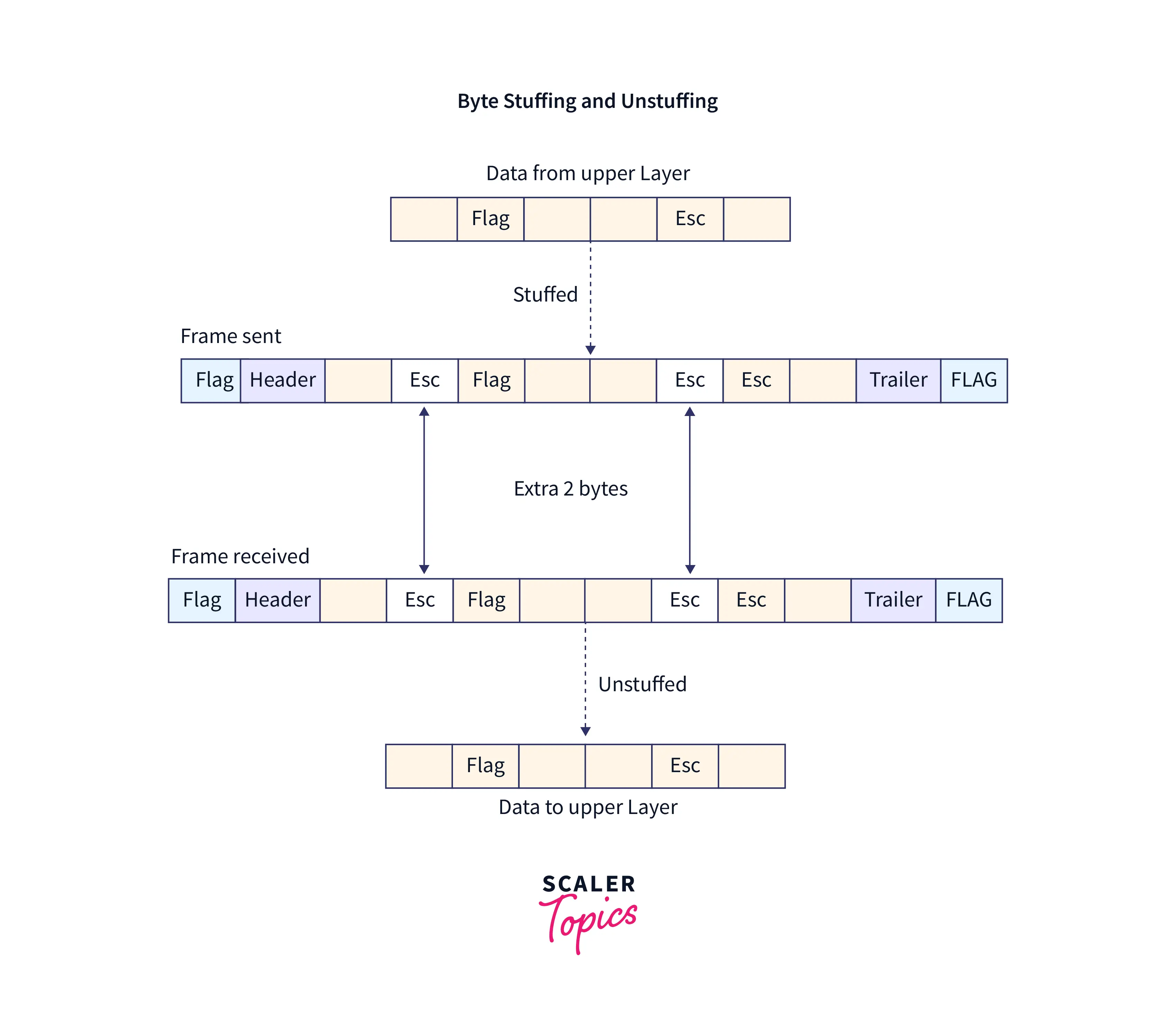 - Byte stuffing is the method of adding the extra 8-bit escape sequence (‘E’) before the occurrence of the flag pattern in the data.