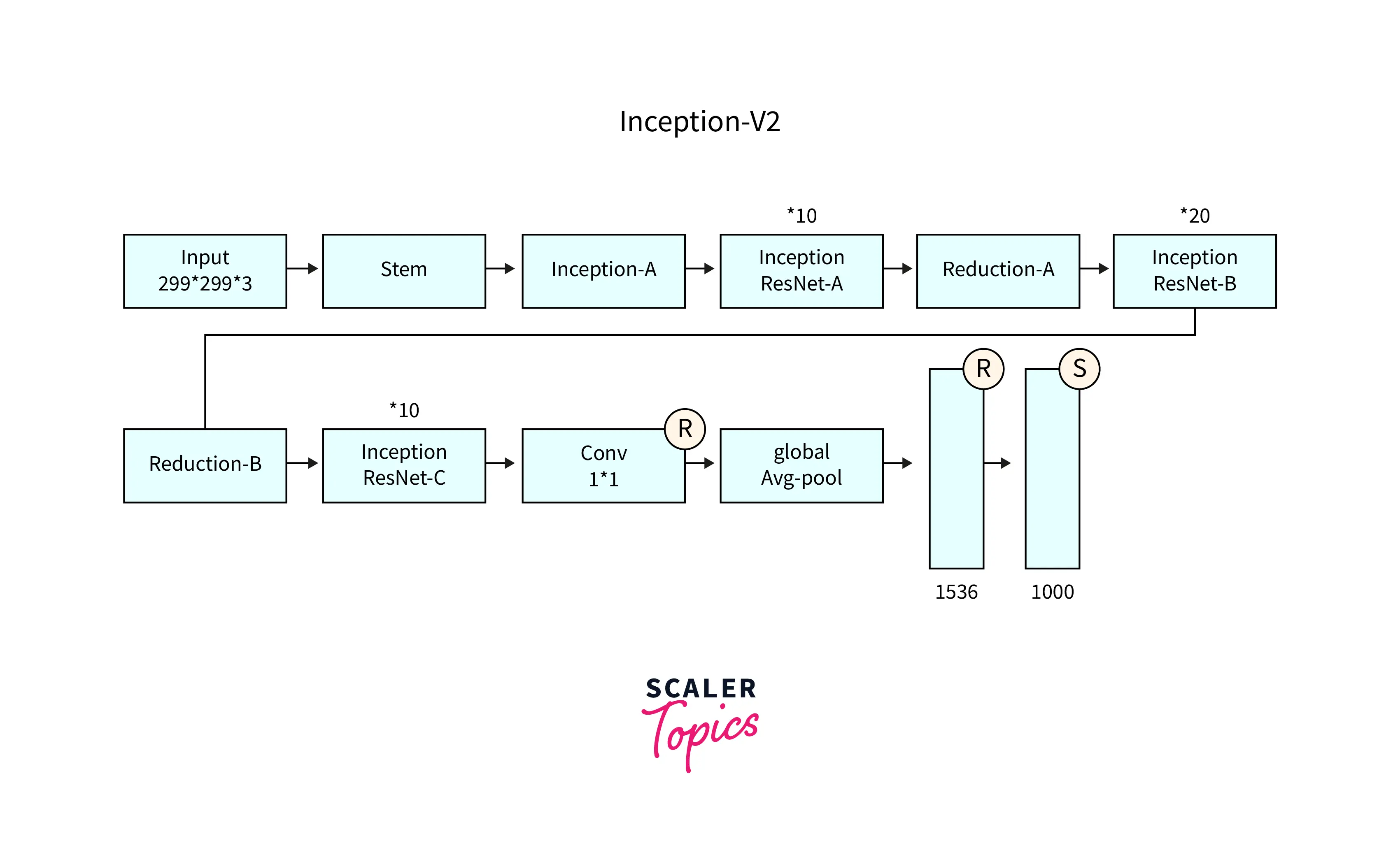 - Inception v2 uses a similar modular architecture, where the network comprises multiple Inception Modules stacked together.