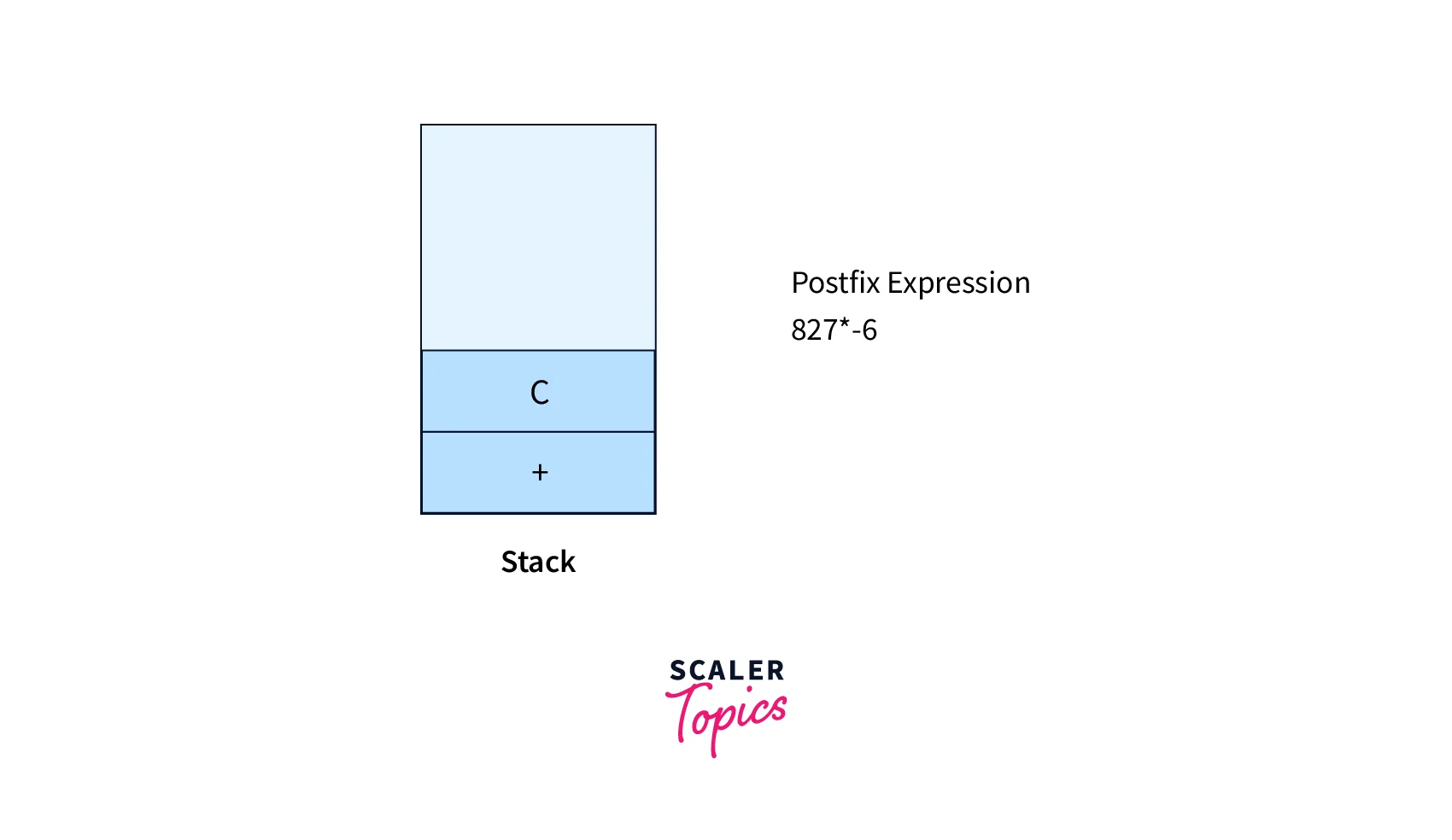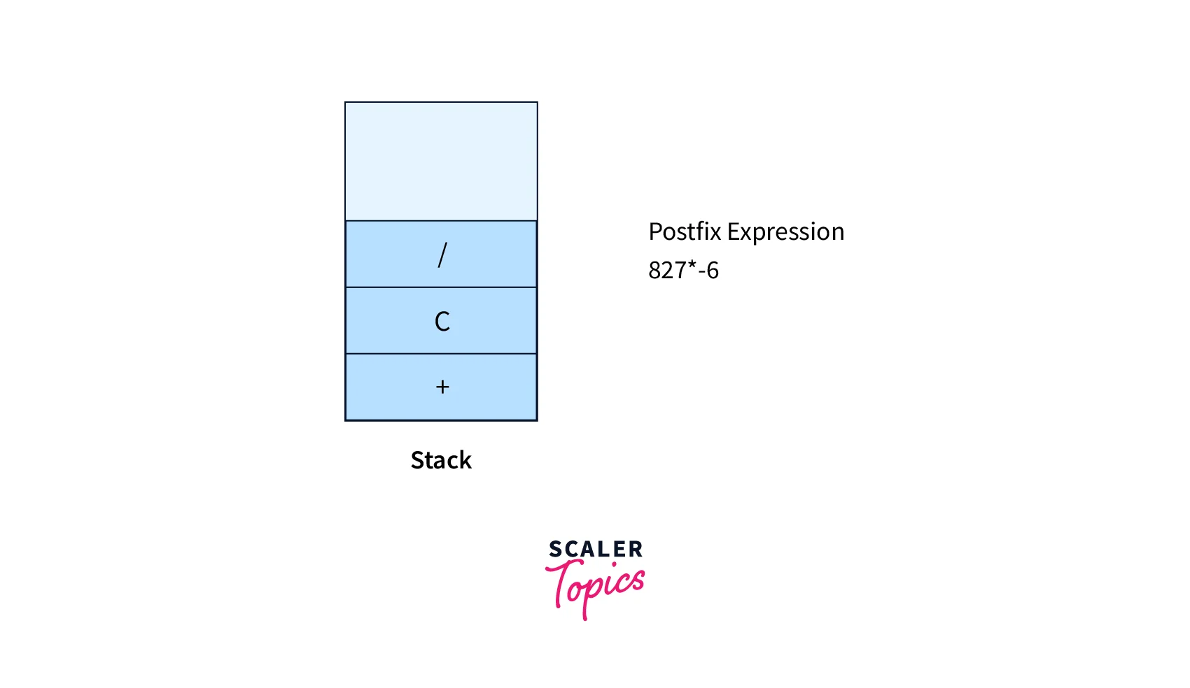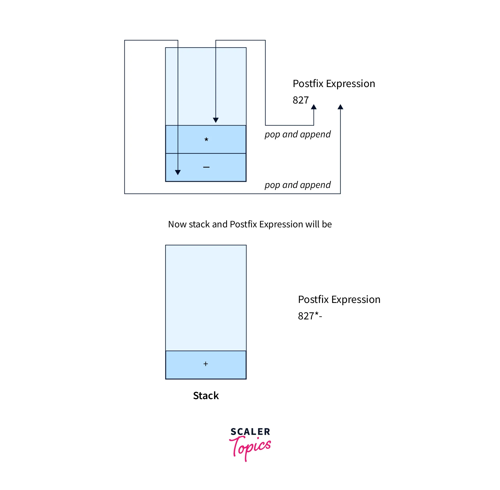 - If the top of the stack contains the operator with high or equal precedence then pop the operators from the stack and append to the postfix expression until the top of the stack will not contain the operator with lower precedence.