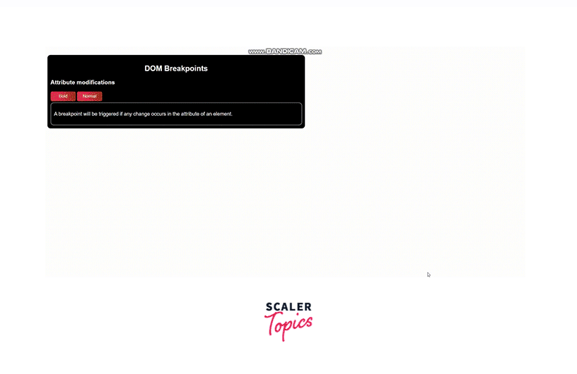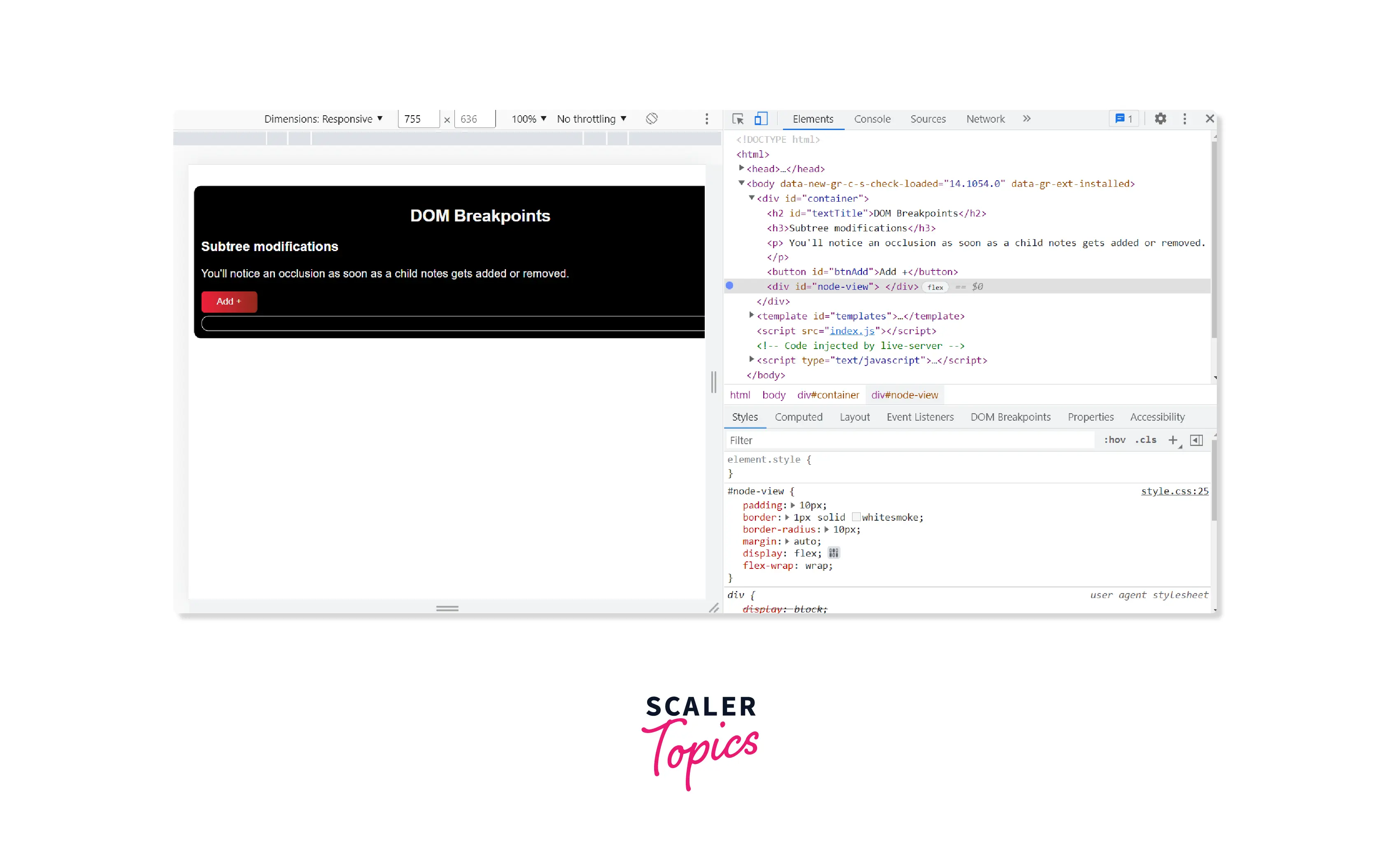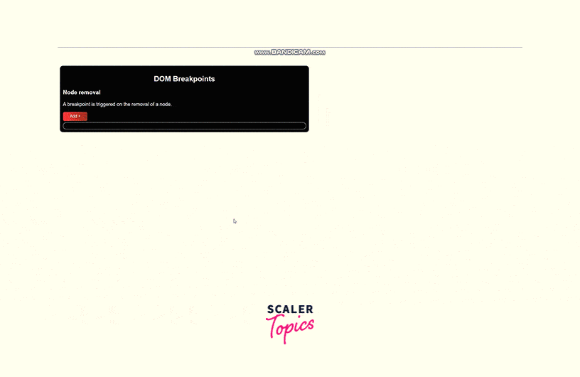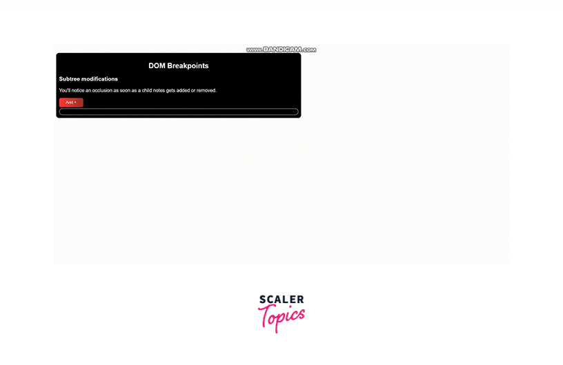 - Subtree modifications: Responds when a child of a currently selected HTML element (henceforth referred to as node) gets added/removed. Let us take an example to show how a breakpoint is triggered for subtree modifications.