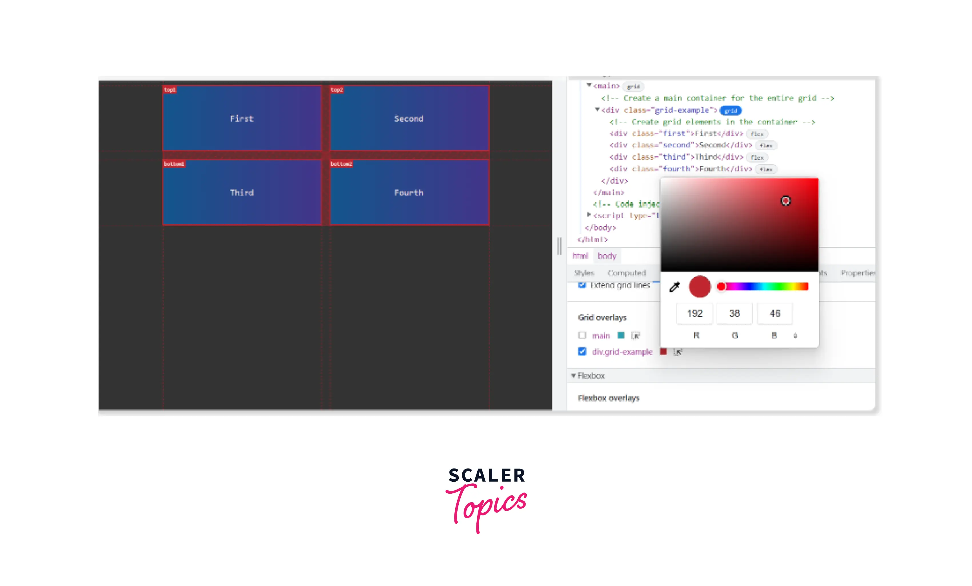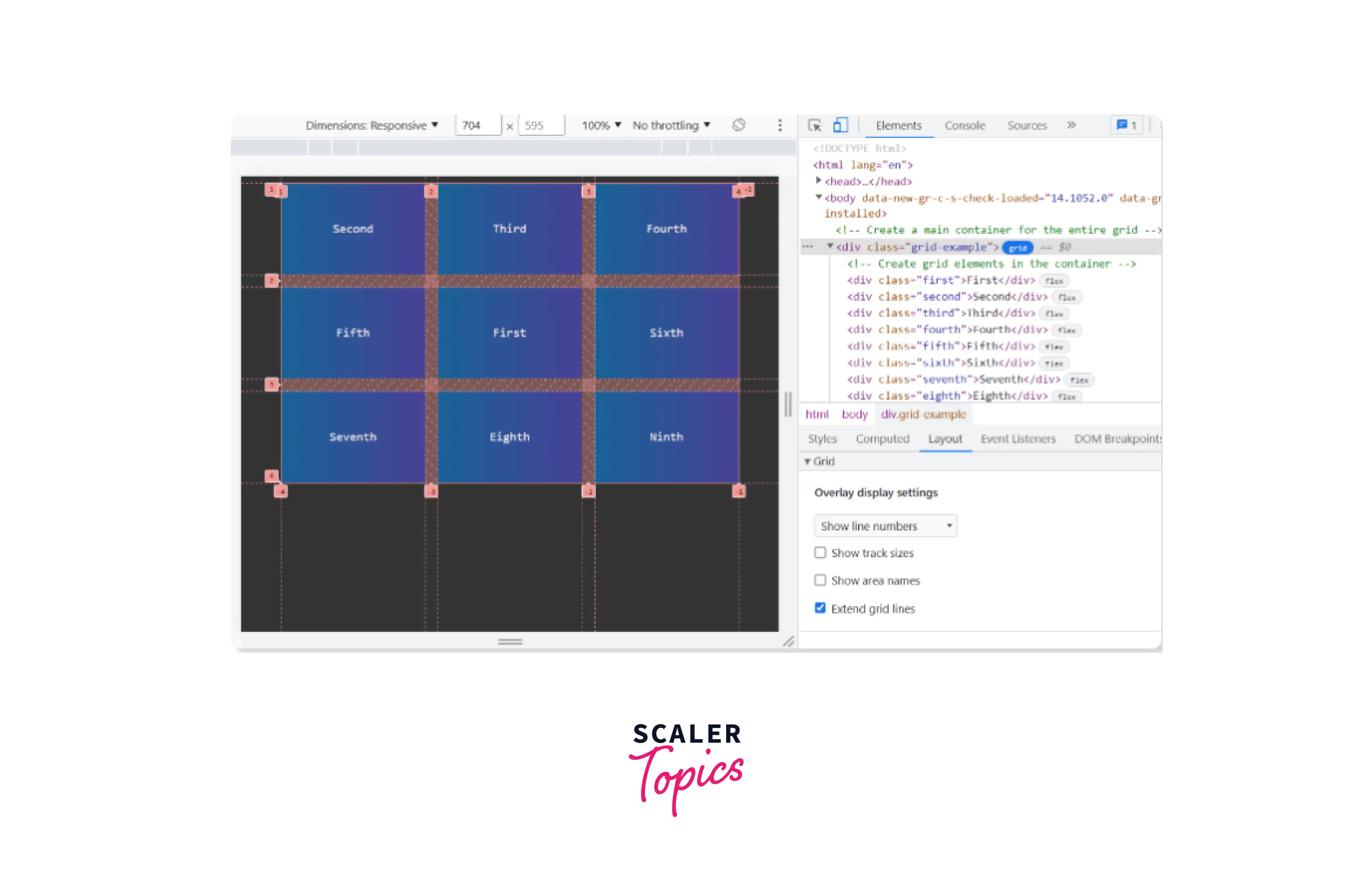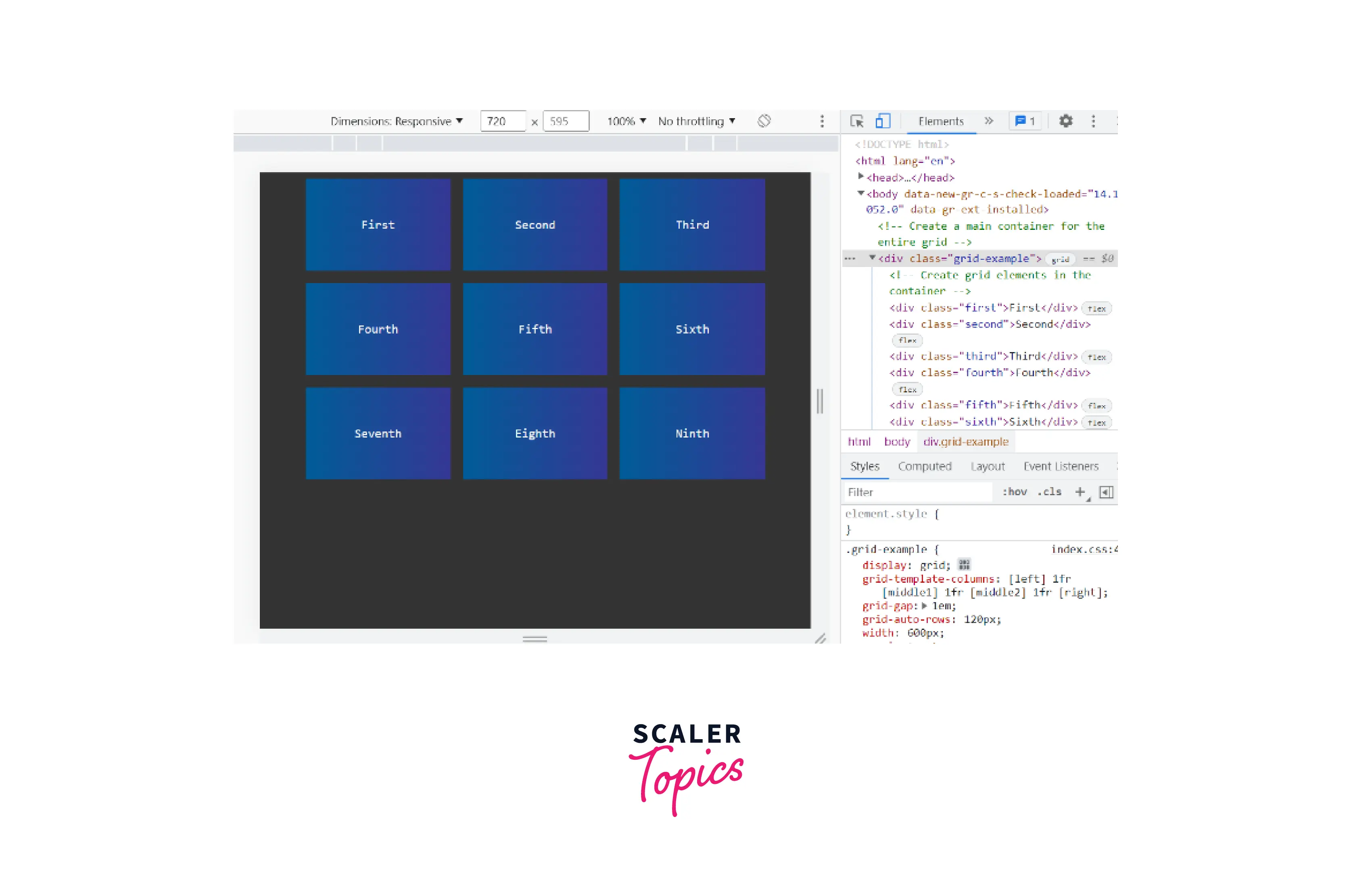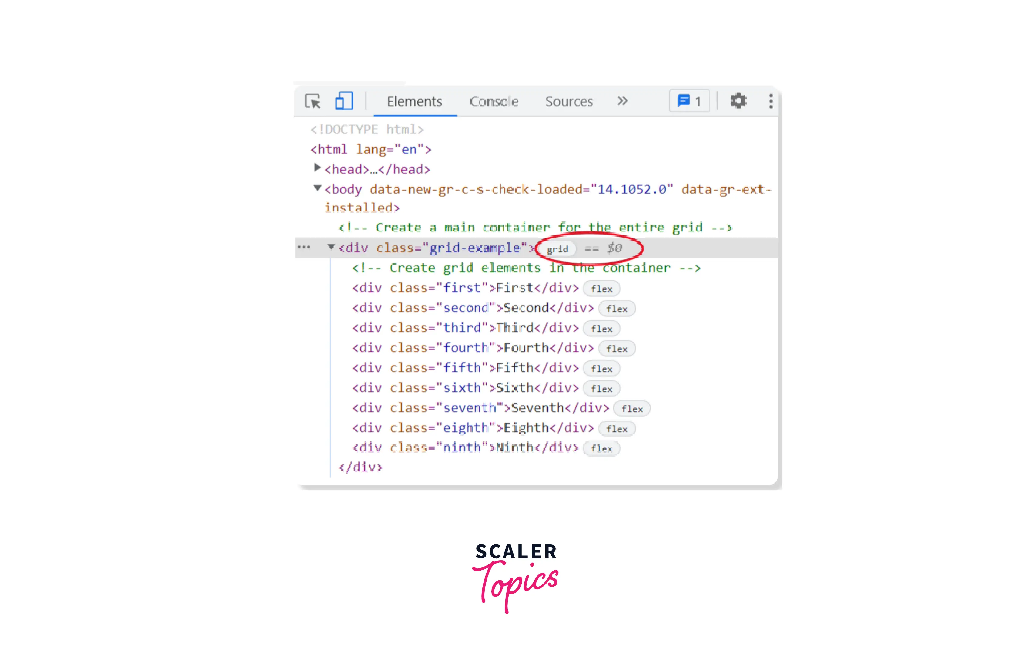 In the above image, we have considered an example of grids. In the Elements panel, any HTML element that exhibits the behaviour of grids will have a grid badge assigned to it. Notice that this is due to the element having either display: grid or display: inline-grid.