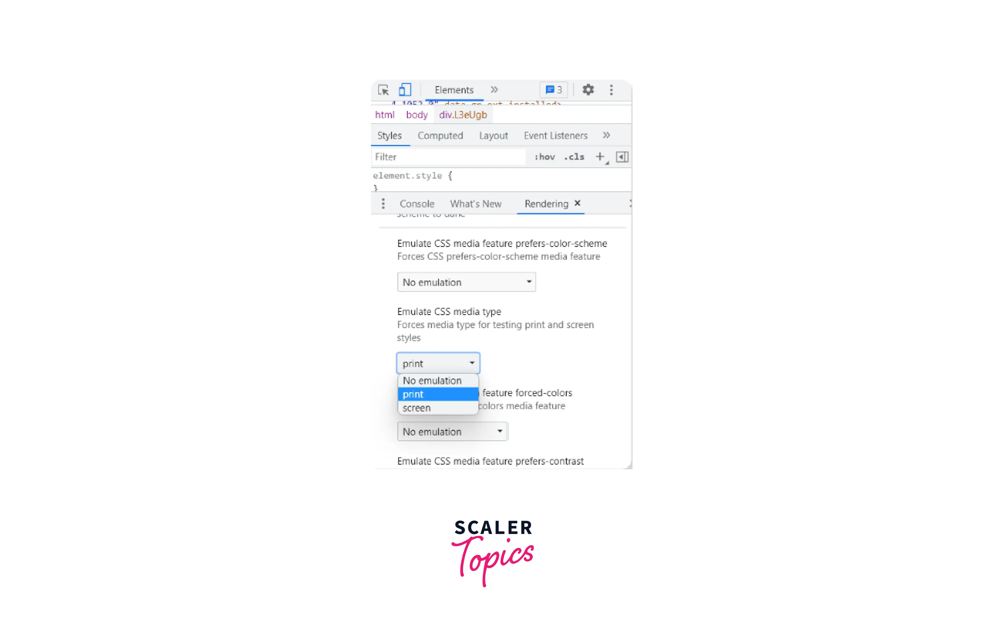 This will lead you to the Rendering panel where you need to look for Emulate CSS media type. Click on the dropdown menu and select print.