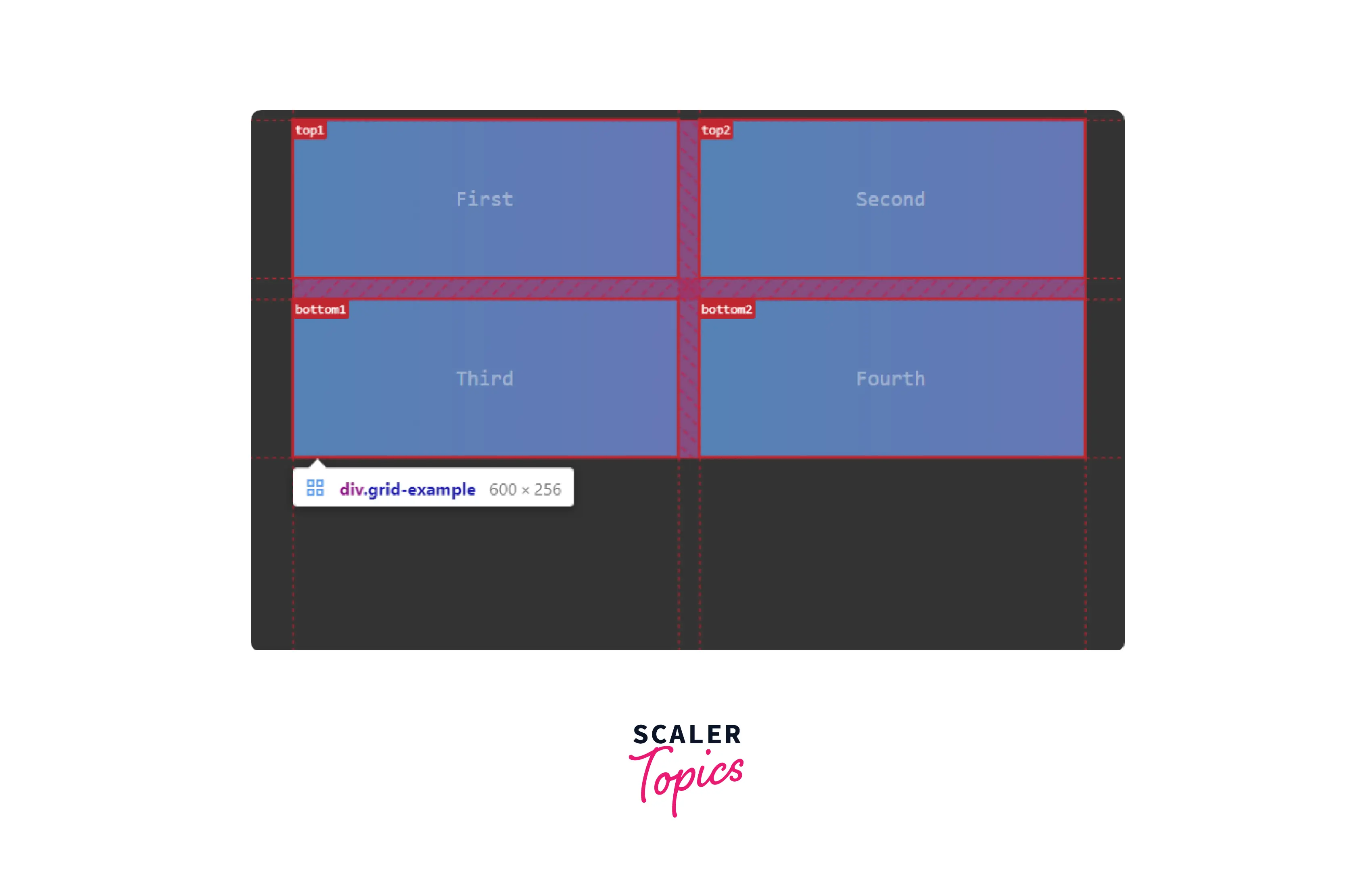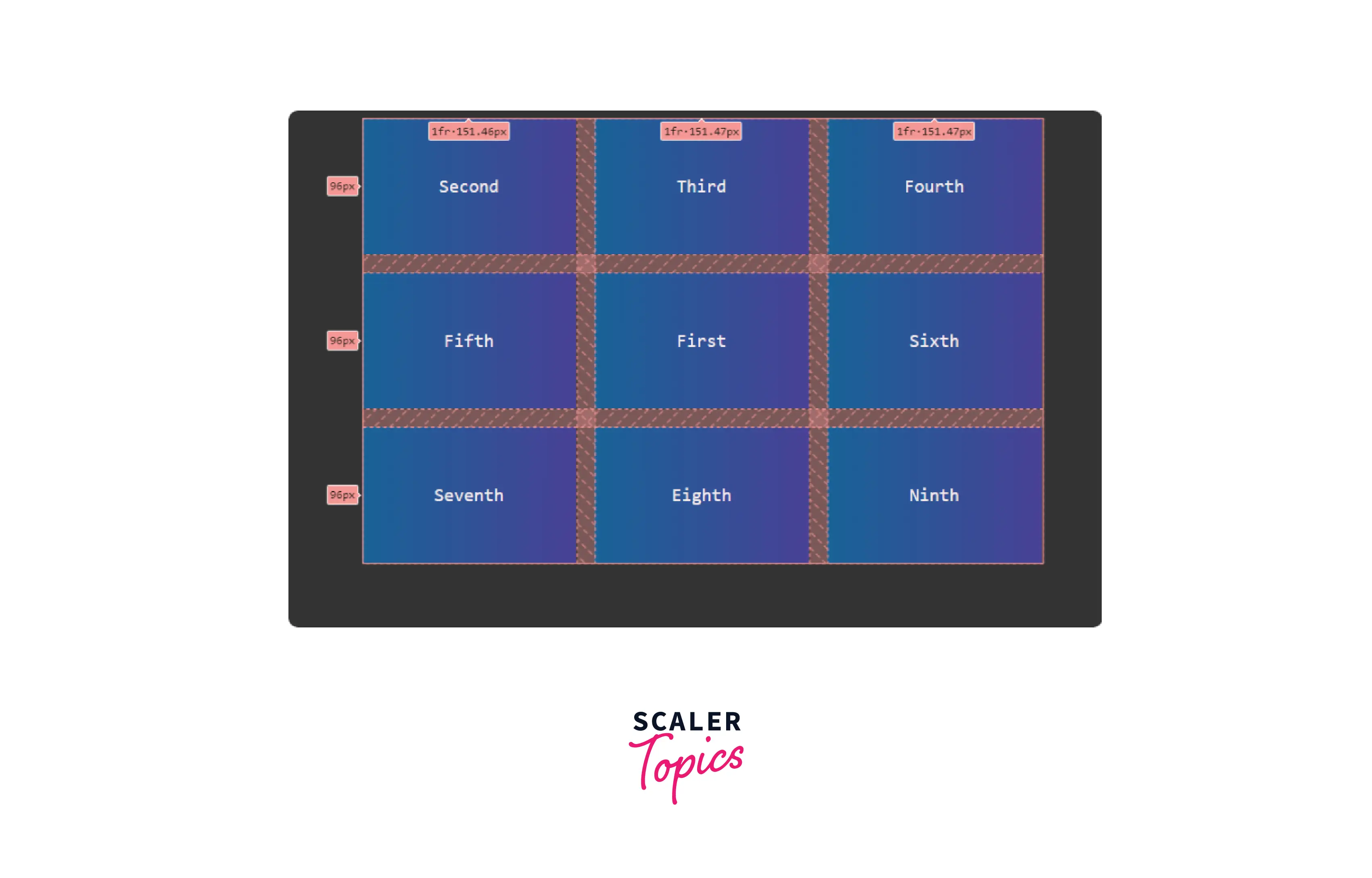 Since we have mentioned the columns to have 1fr (fractional unit) of the screen, the track size will be displayed as 1fr-151.47px (authorized - computed). Rows, on the other hand, have no authorized value, so only their computed size (96px) will be displayed.