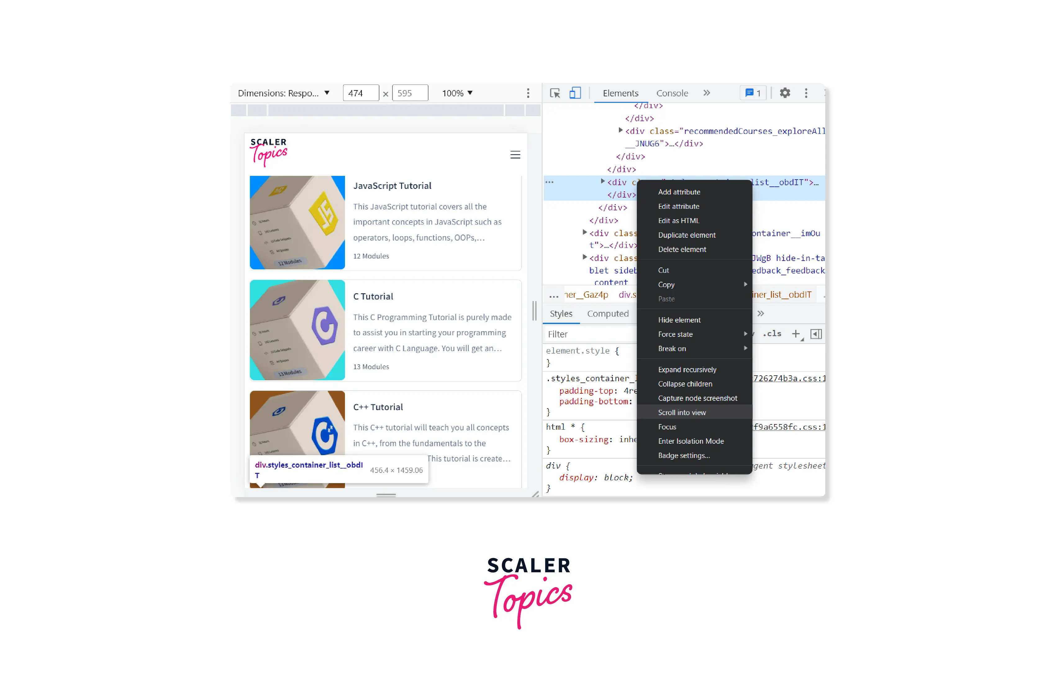 If the selected element in the Elements tab isn't visible in the viewport, Scroll into view helps to bring the element to the visible area.