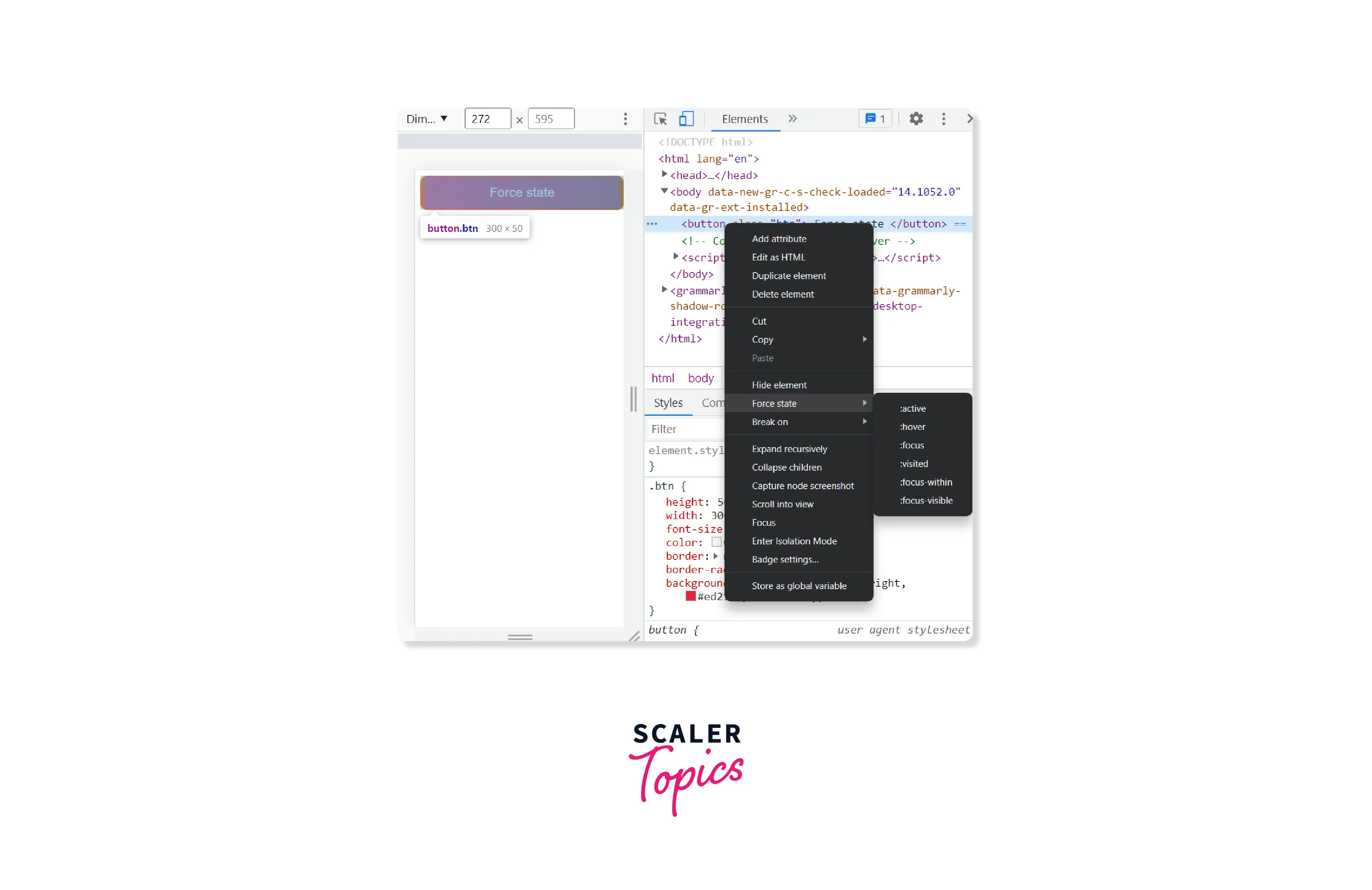 Now, right-click on the button and click on Inspect. Since the element is already selected, right-clicking again on the HTML element will open up the menu where you can Force state option.