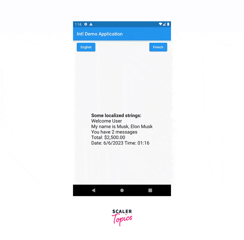 This code snippet produces a Text widget that exhibits "Hello World!" when the device's locale is set to English, and "¡Hola Mundo!" when the device's locale is set to Spanish. The method name of each getter corresponds to the key of the respective entry in the arb files, while the localized message is stored as the value of that entry. Hence, Intl flutter helps developers to dispaly text in their preferred language as per requirement.