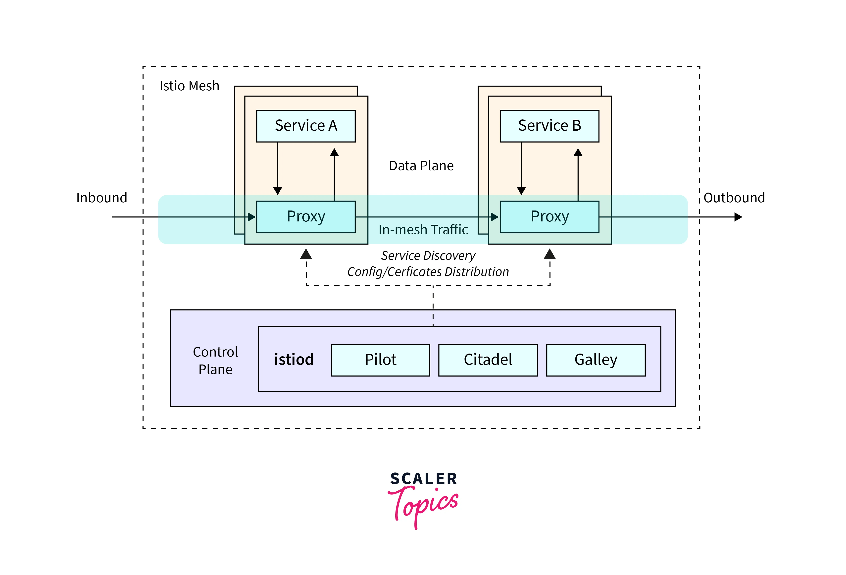 - Pilot: The pilot is responsible for managing and configuring the sidecar proxies in the data plane. It sends configuration information to the proxies, including routing rules, timeouts, retries, and fault injection policies.