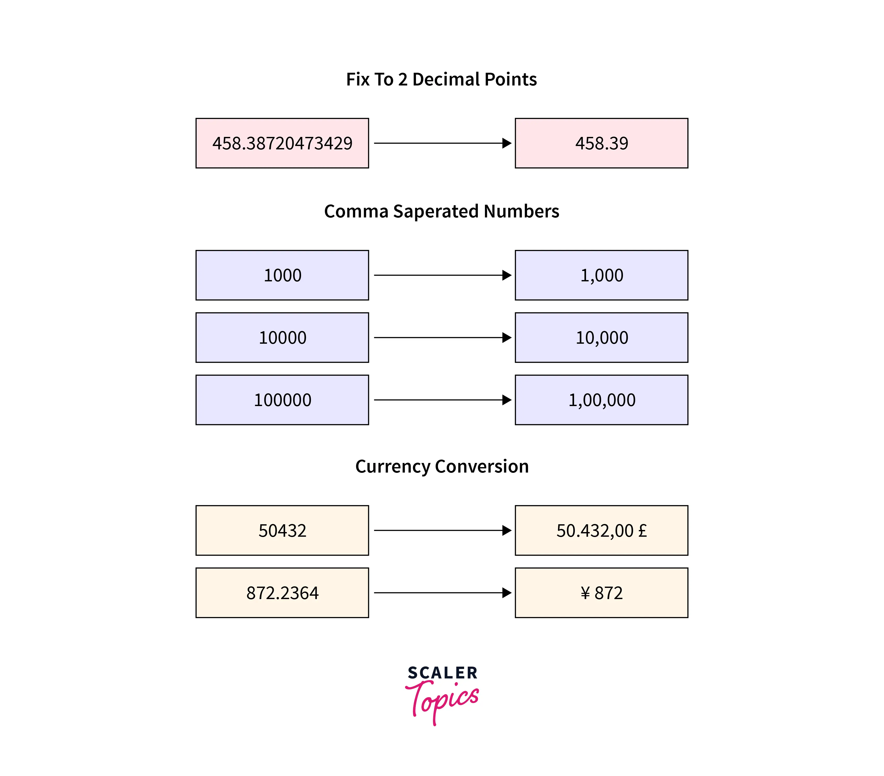 In most cases, converting a long float value to a precision of 2 or 3 comes up while programming. Like 3.141592 => 3.14. Additionally, you may need to convert a number to another unit of currency, such as 100 to $100, or to a general big number into a comma-separated number, such as 1000000000 to 1,000,000,000.