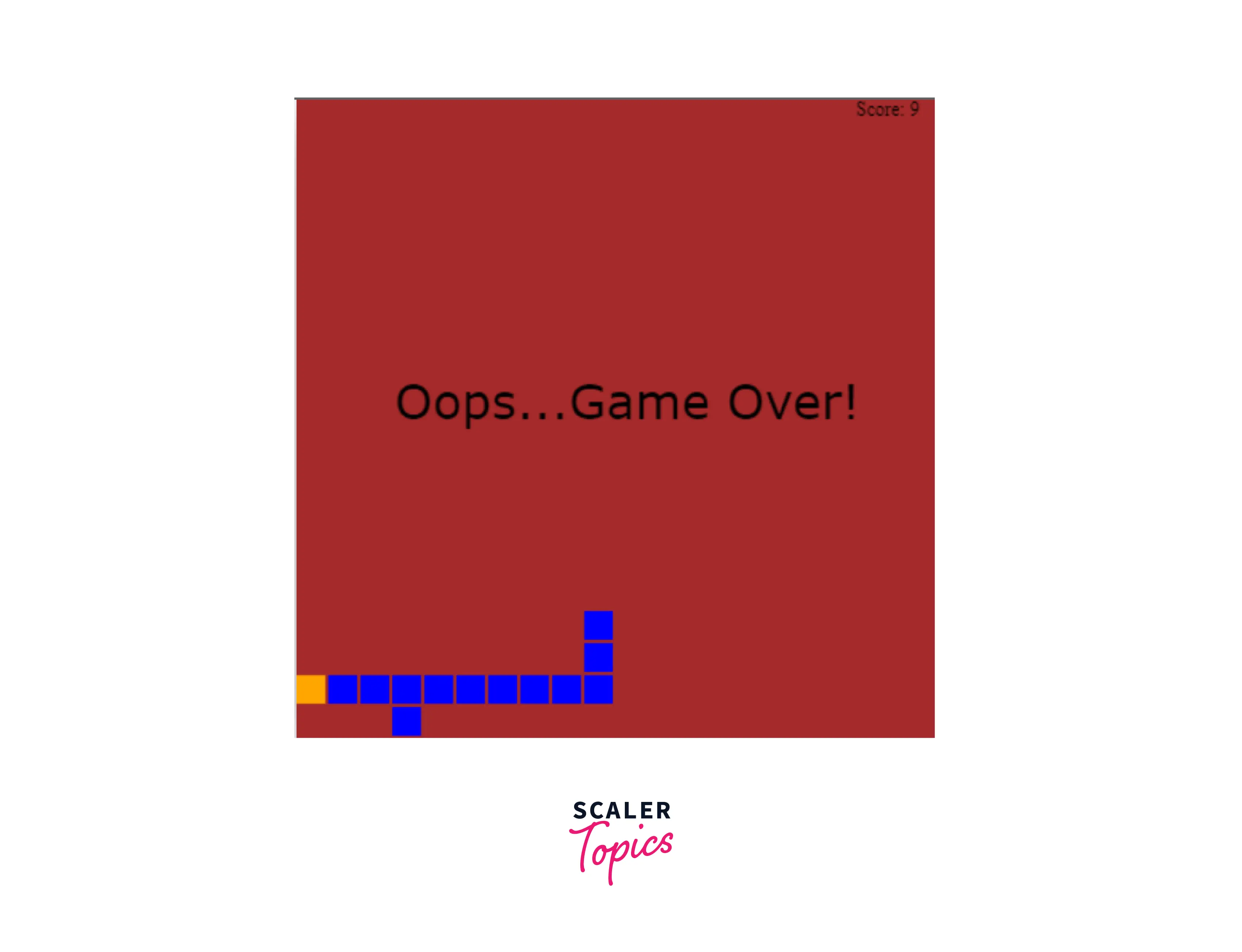 - When collides with its own body. For this, we have to declare a function isGameOver() which returns true or false. Initially, the variable gameisover will be initialized as false which could be changed based on the conditions given inside the function.