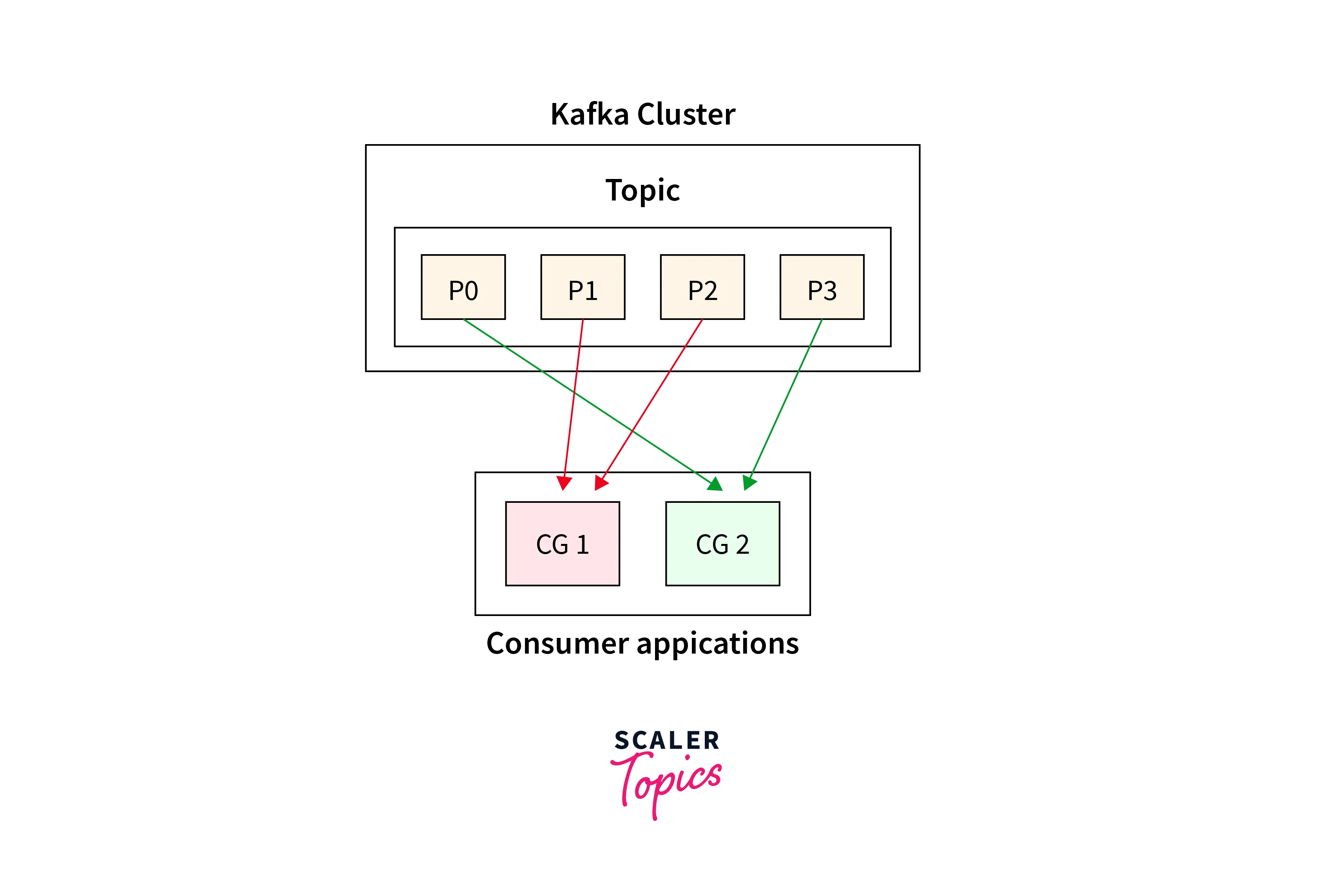 Below is the representation of how two Consumer Groups 1 and 2 are consuming from a single Kafka topic having four partitions (that is, P0 to P4).