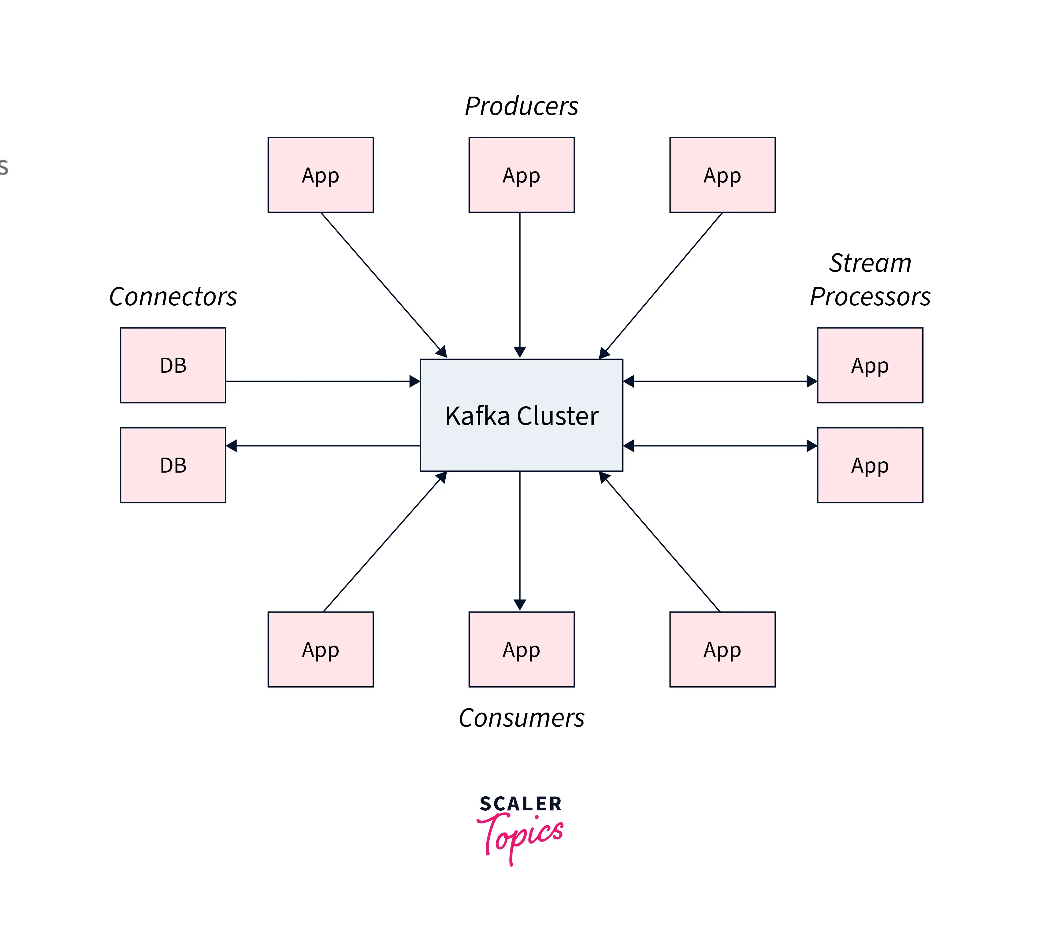 Producer API: For publishing a stream of data records to a Kafka topic, Kafka uses the producer API. Consumer API: For subscribing to Kafka's topics and processing their streams of data records, Kafka uses the consumer API. Streams API: With the Streams API, Kafka authorizes the systems to work as stream processors. Here, the input stream is taken up from the topic which is then transformed into the output stream transferring the data records across various output topics. Connector API: With the Connector API, any external system or application can be easily integrated with the Kafa architecture. The stems can be automated with the data system to any of their current Kafka topics.