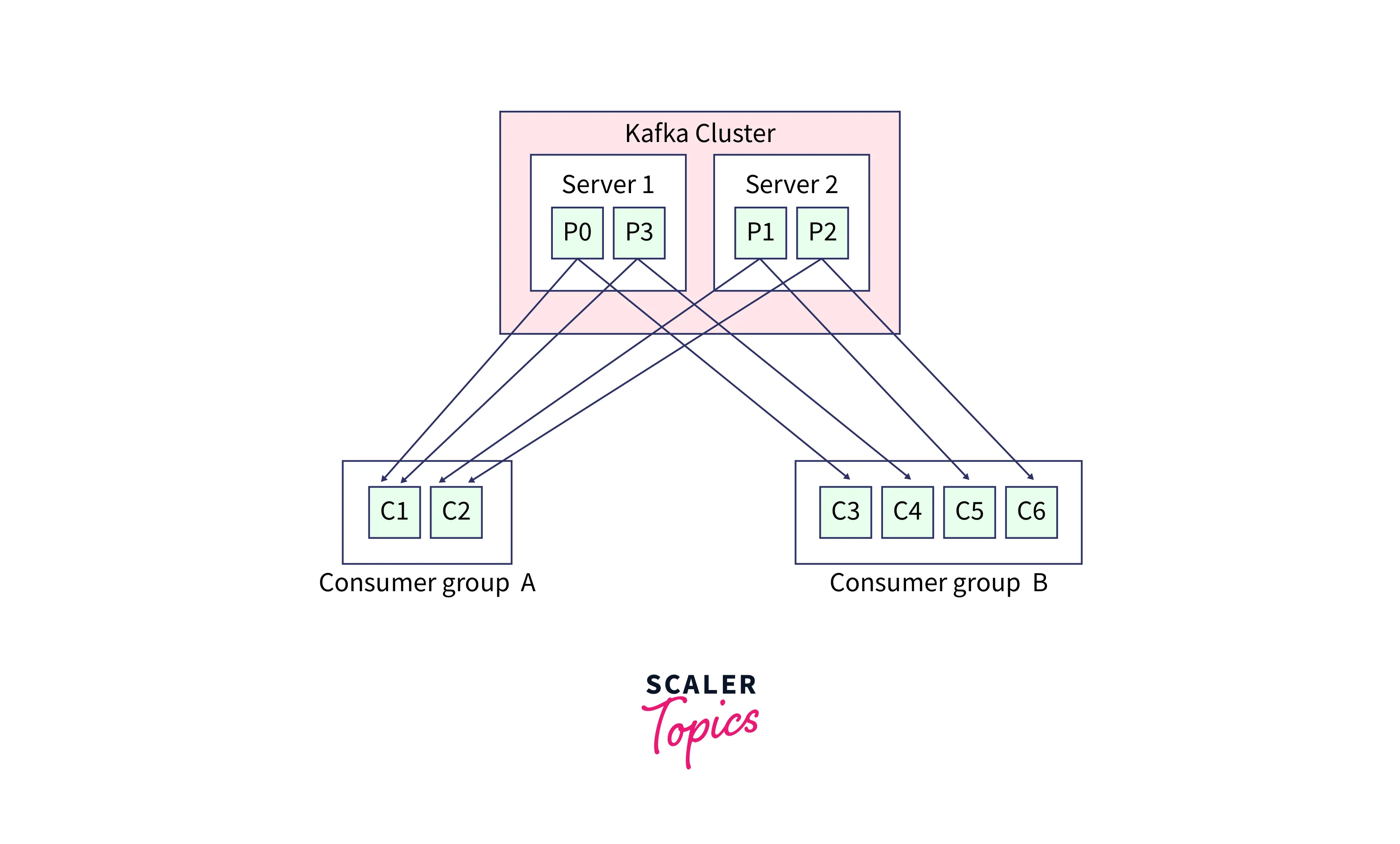 If the 2 partitions from Server 2 are serving Consumer Group B having 4 consumers, then at first only 2 consumers will be working and consuming the messages while the other two will be left idle. This case is similar to how the situation will resonate for Consumer Group A also. But when any consumer fails, in both the Consumer Grup, A, and B, A will not be able to recover while one of the idle consumers can start to cover up and start consuming the message from the assigned partition.