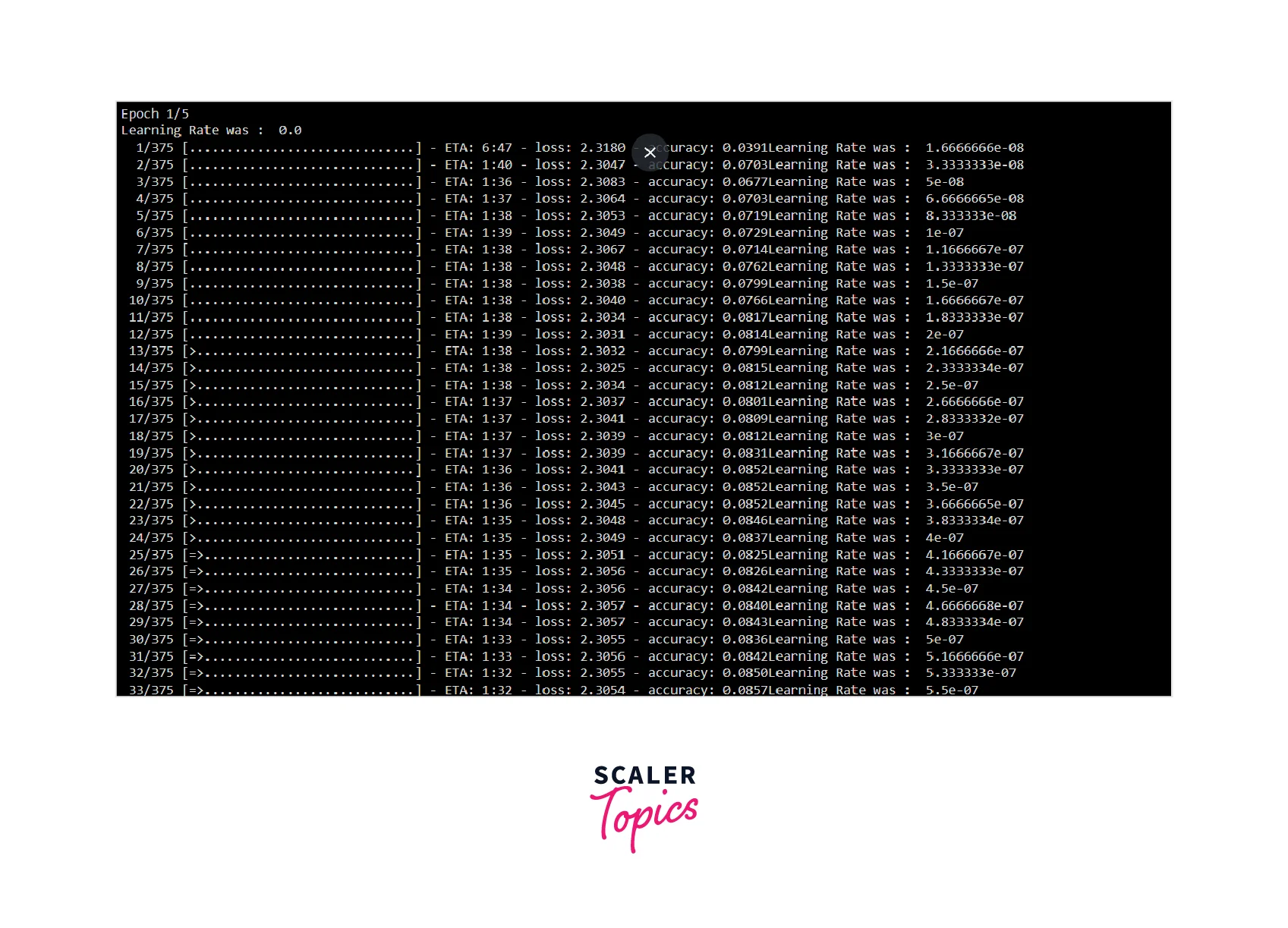Finally, while executing the training code snippets we will see the outputs as shown below image which has the printing statement which we included in the Warmup Cosine Learning Rate (lr) Scheduler implementation, i.e., it prints the Learning Rate (lr) at the end of the batch.