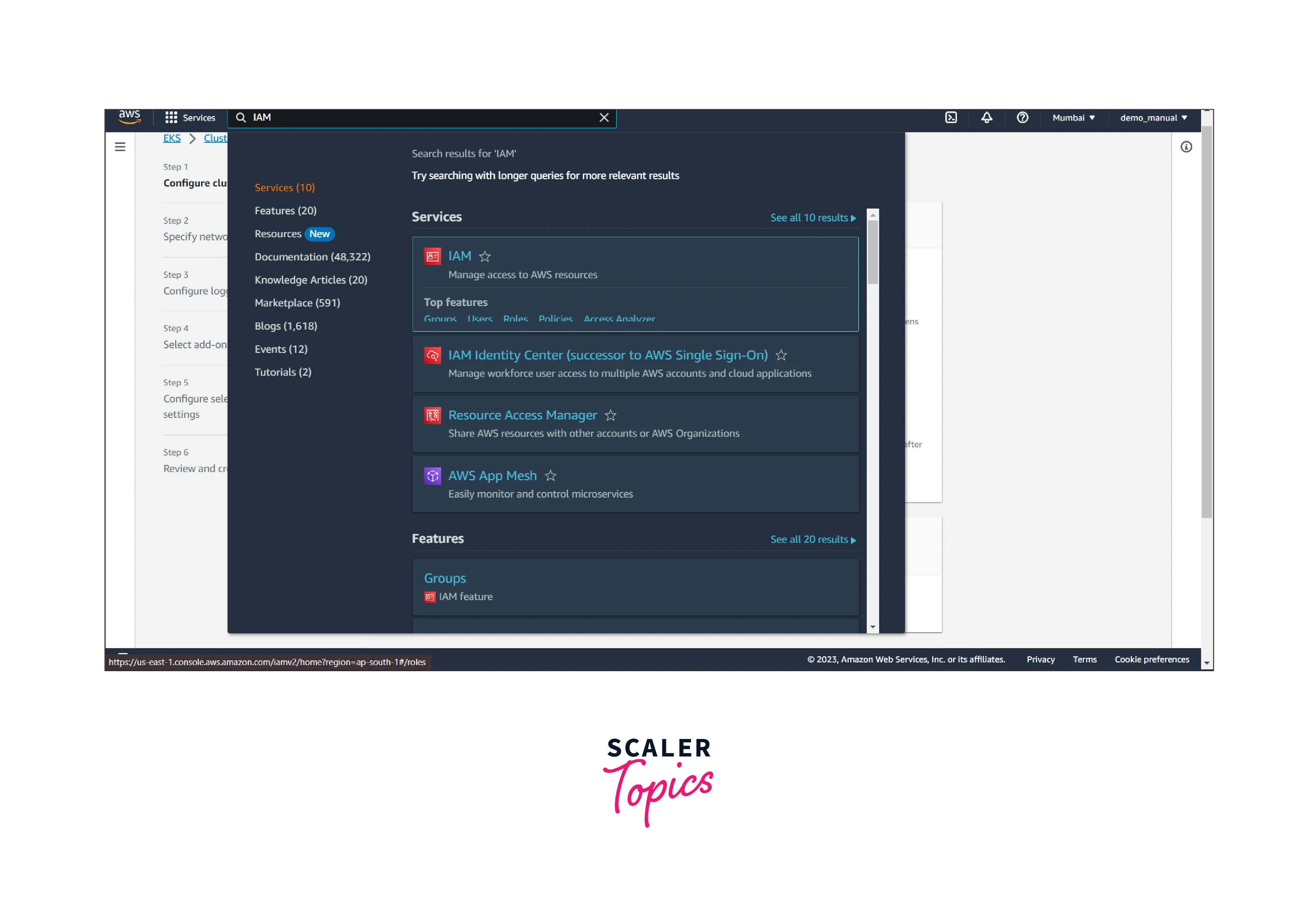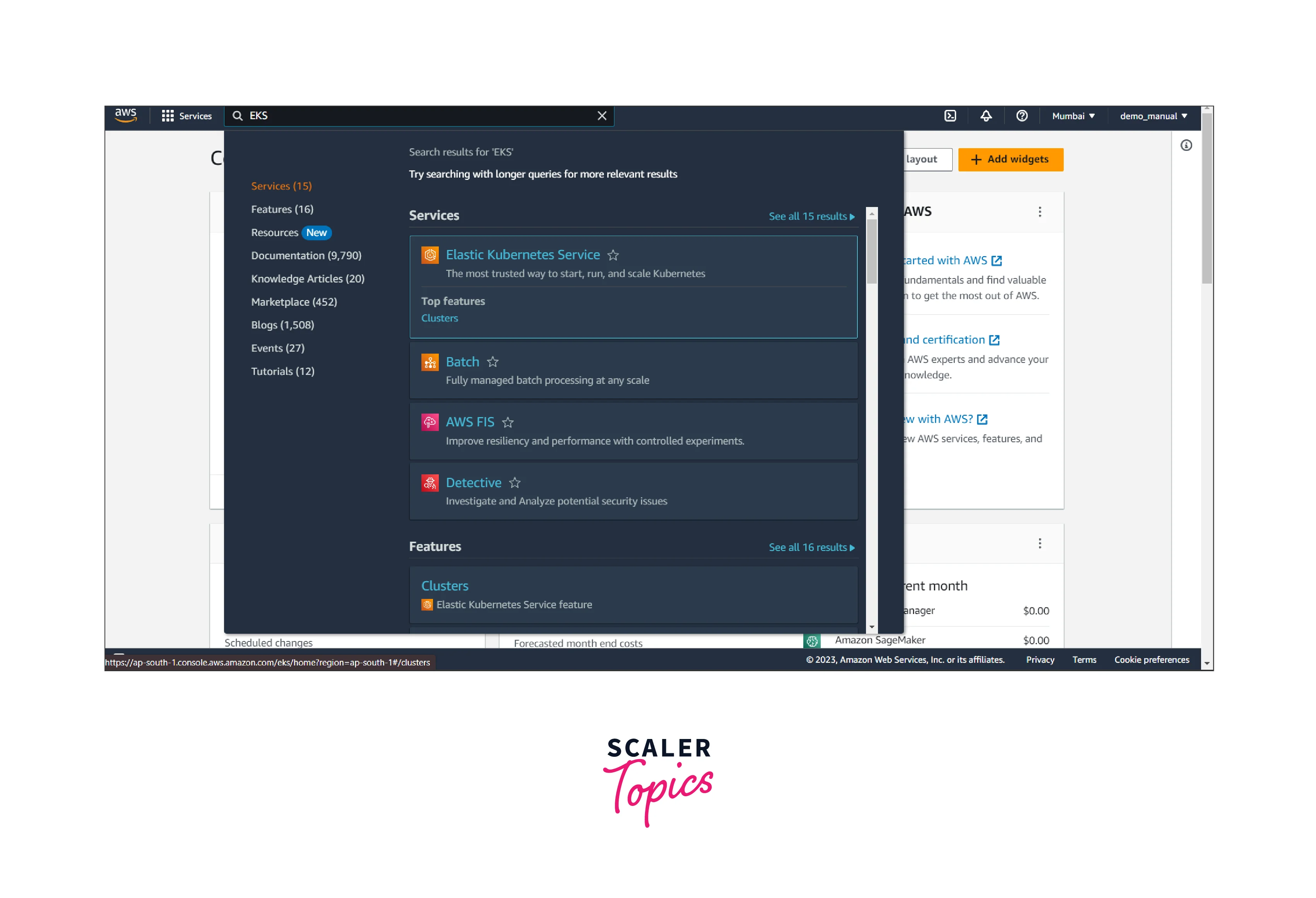 Go to the "Services" dropdown, select "Elastic Kubernetes Service" under "Compute".