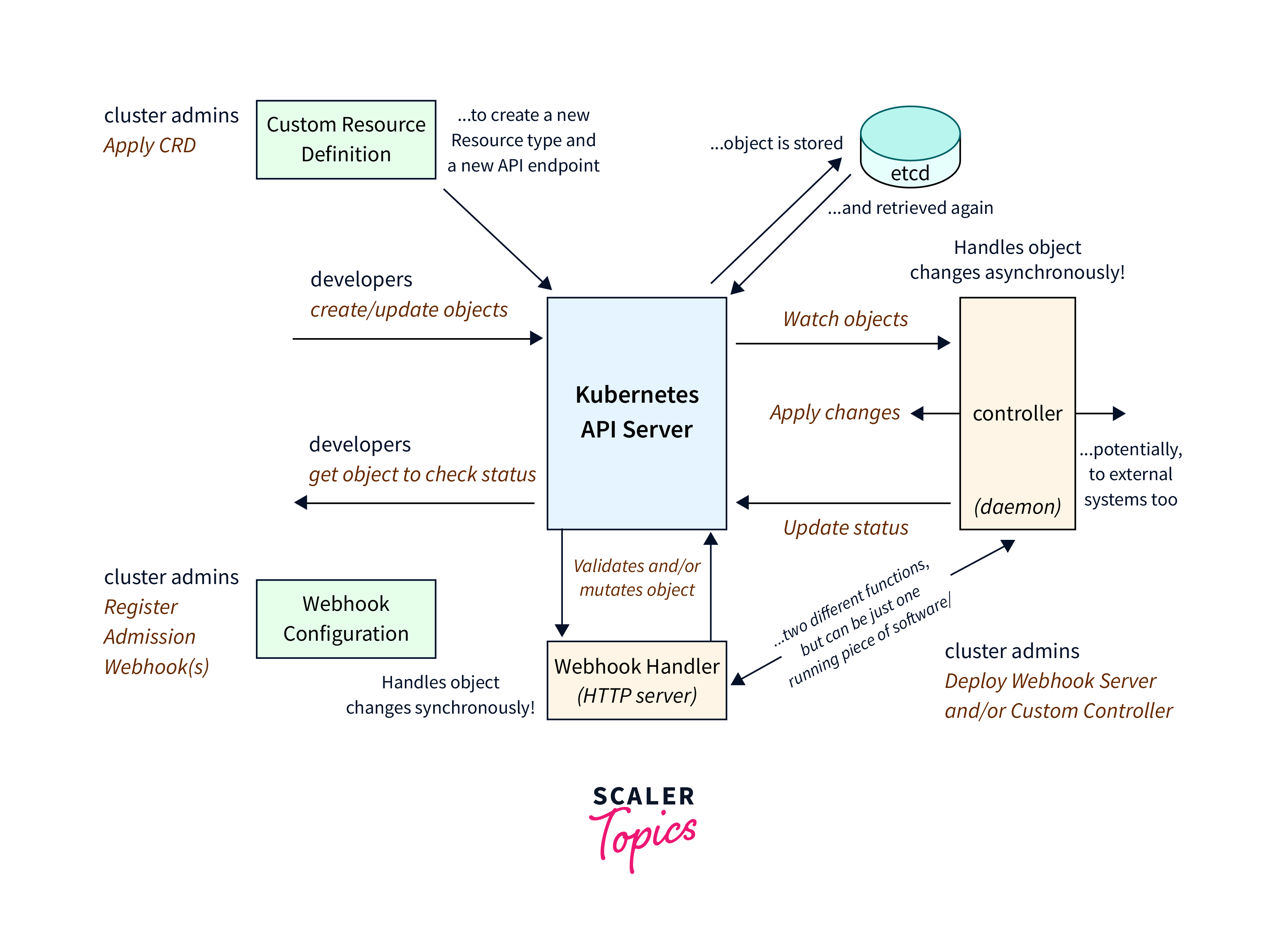 Here we can see that we can extend the Kubernetes API with the aggregation layer, API server extensions, and custom resources.