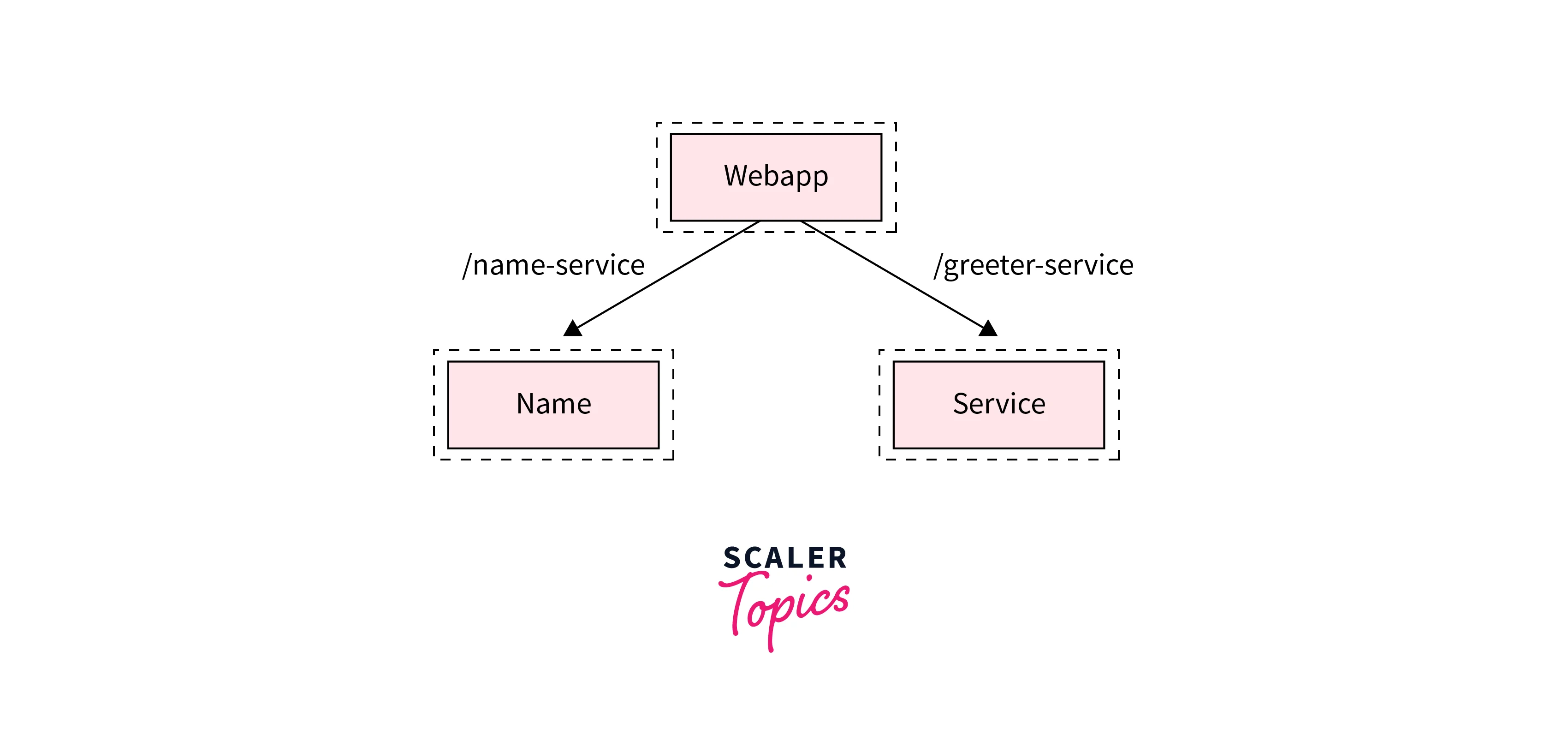 Assume that these services are built and deployed as Docker images in Kubernetes. The "webapp" service necessitates the configuration of the subsequent environment variables to establish communication with the "name" and "greeting" services. The NAME_SERVICE_HOST GREETING_SERVICE_HOST and NAME_SERVICE_HOST GREETING_SERVICE_HOST environment variables establish references to these services based on their labels, obviating the need for static references like pod or host IP addresses.