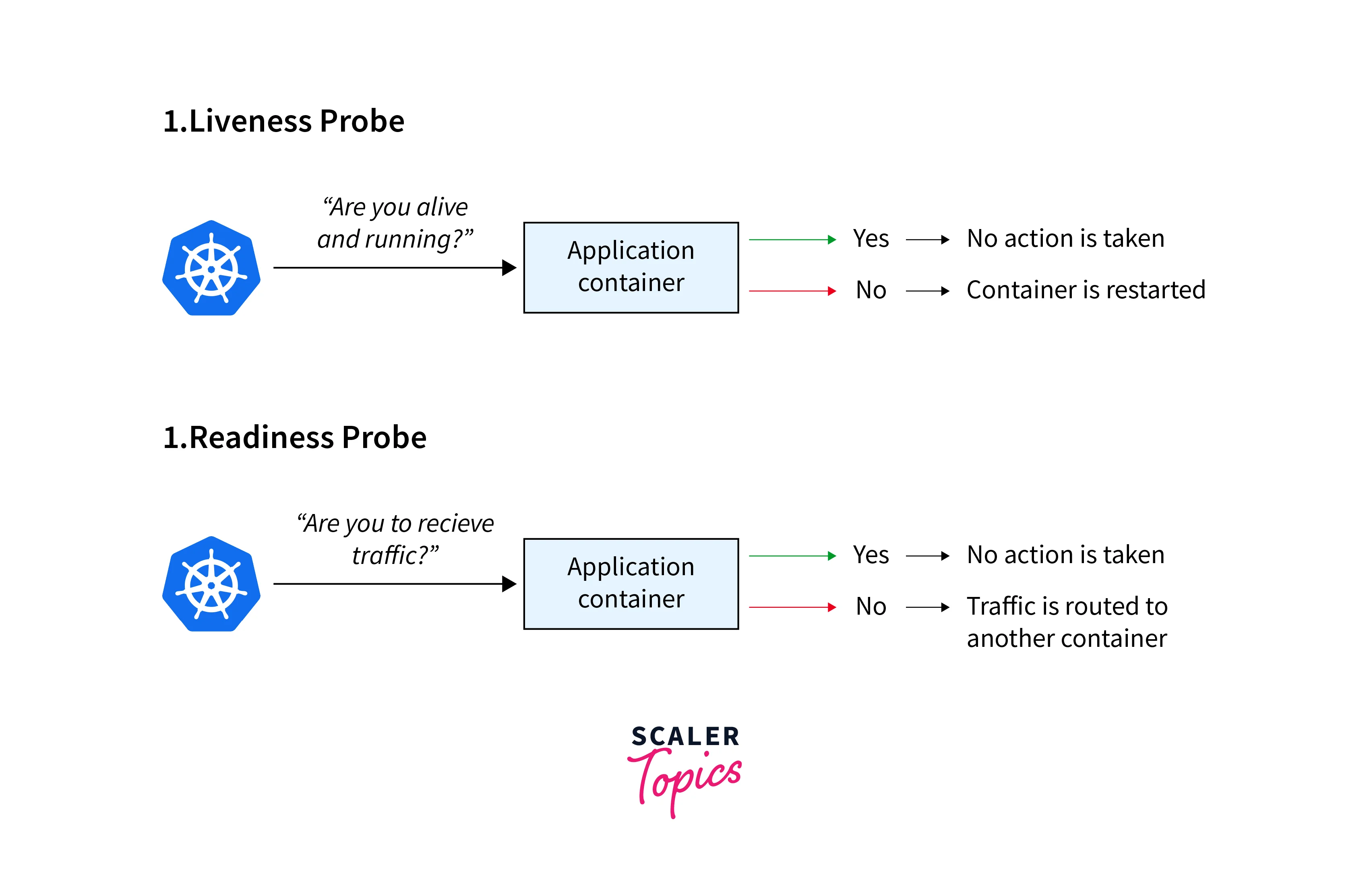 - Startup probe ensures pod creation, Liveliness probe checks application functionality, and Readiness probe confirms traffic handling.
