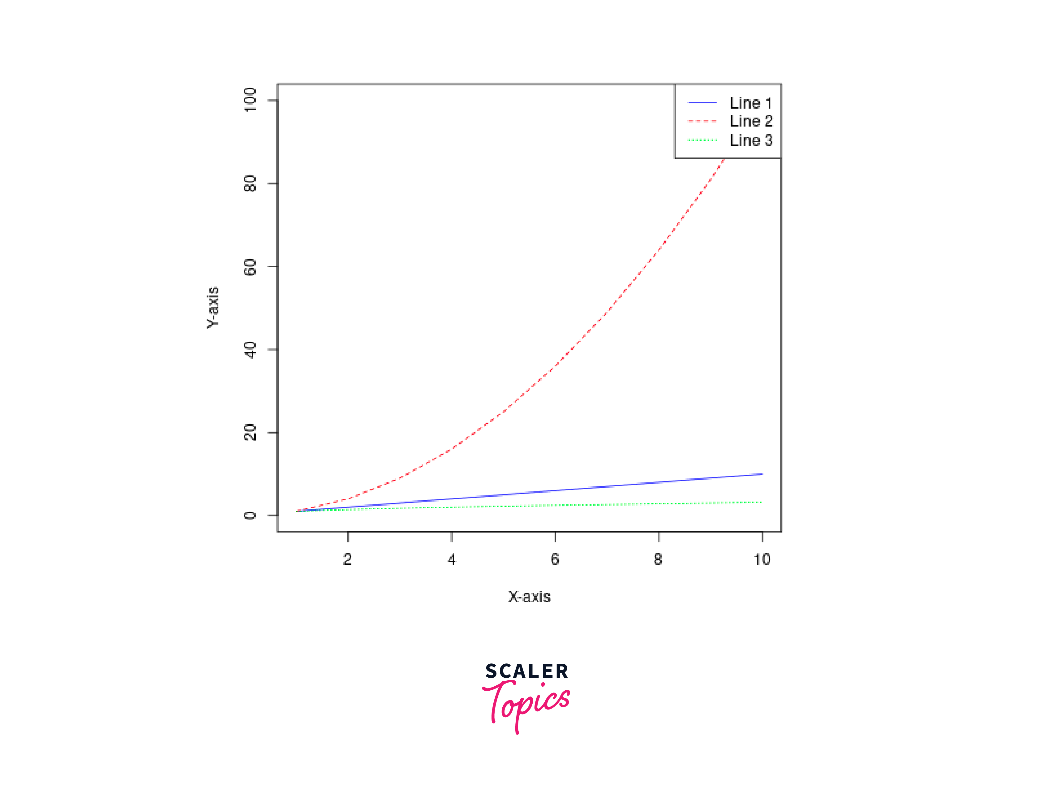 You can change the values of lty to use different line types. For example, you can use lty = 2 for dashed lines, lty = 3 for dotted lines, and so on. The lty argument provides flexibility in customizing the line types for your plots in R. The plotted graph is shown below.