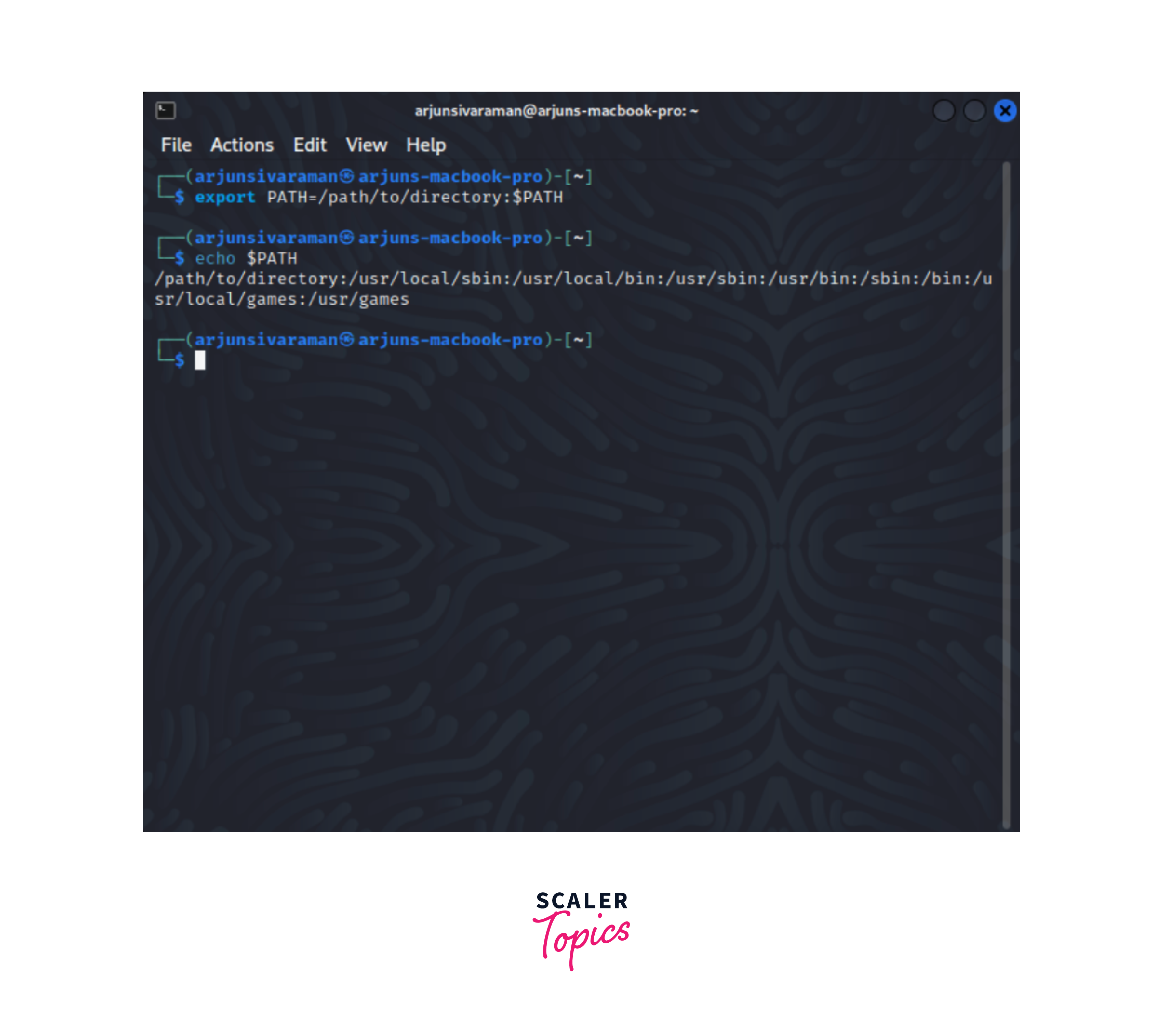 - Verify the changes: To confirm that the directory has been added to the PATH, you can use the echo command to print the PATH variable: