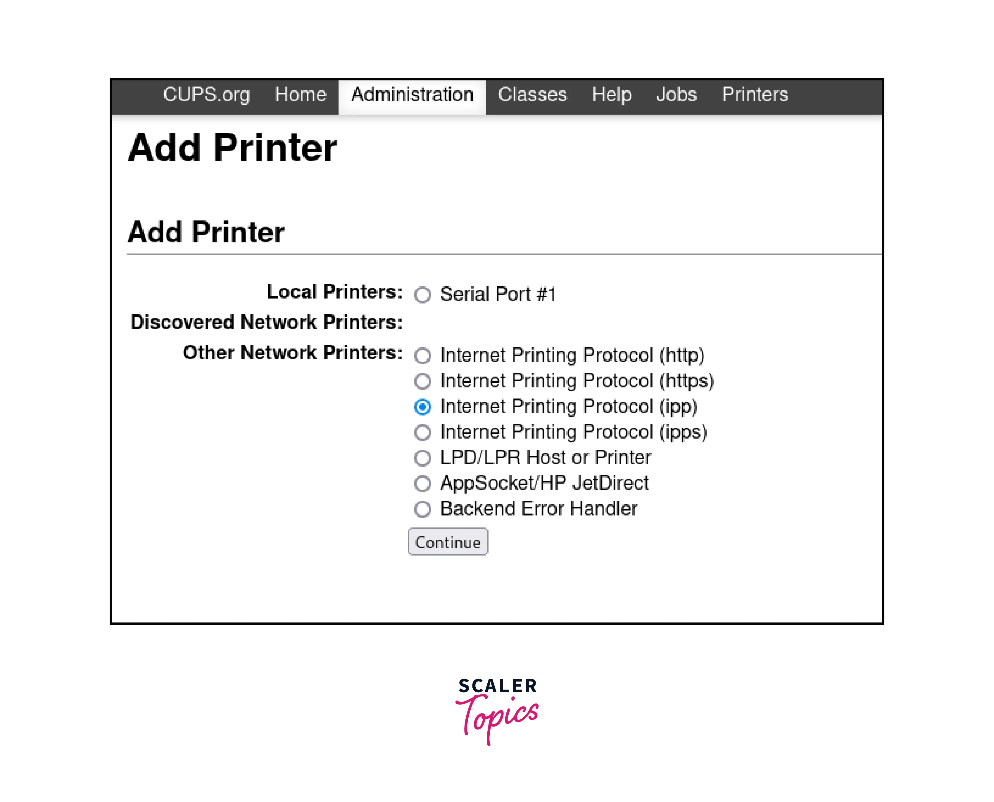 Select the appropriate connection type for your printer. CUPS supports various connection types such as USB, network (IPP, LPD), Bluetooth, and more. Choose the option that matches your printer's connection method. - Specify Printer Details: