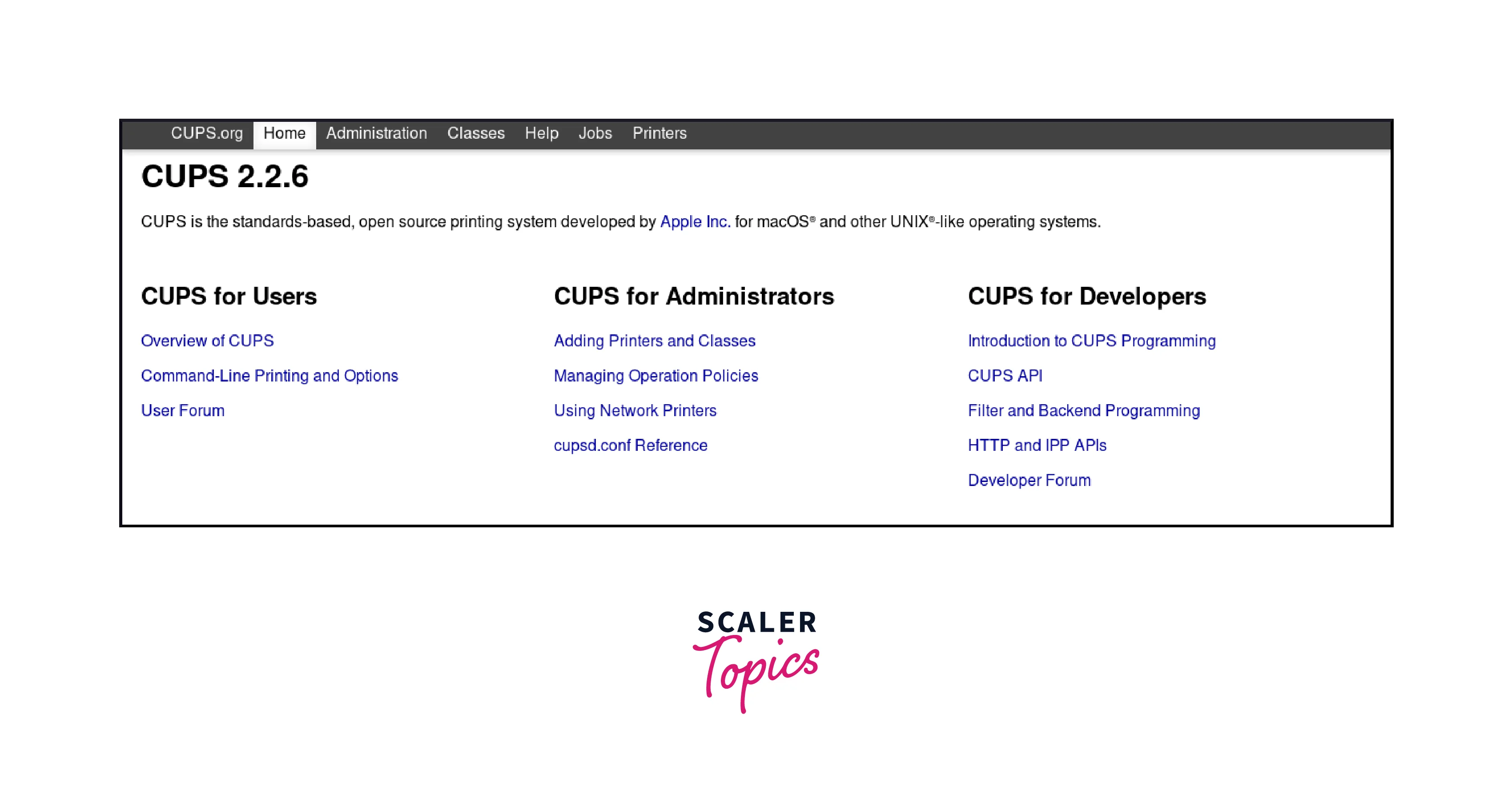 - The CUPS web interface provides access to documentation and helps resources for troubleshooting and additional guidance.