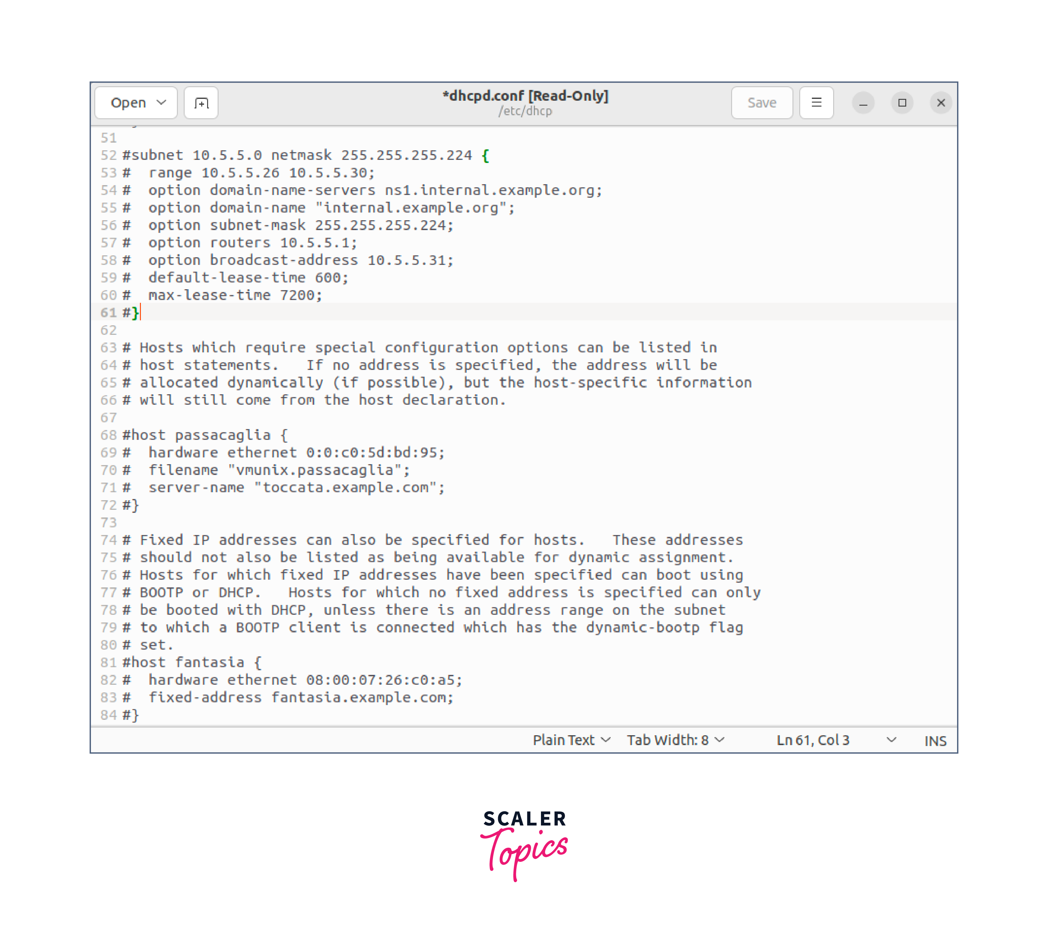 The main configuration file for the Linux DHCP server is located at /etc/dhcp/dhcpd.conf. Open the file with a text editor and configure it according to your network requirements. You can specify IP address ranges, lease durations, and other DHCP parameters. An example of the same has been shown below.