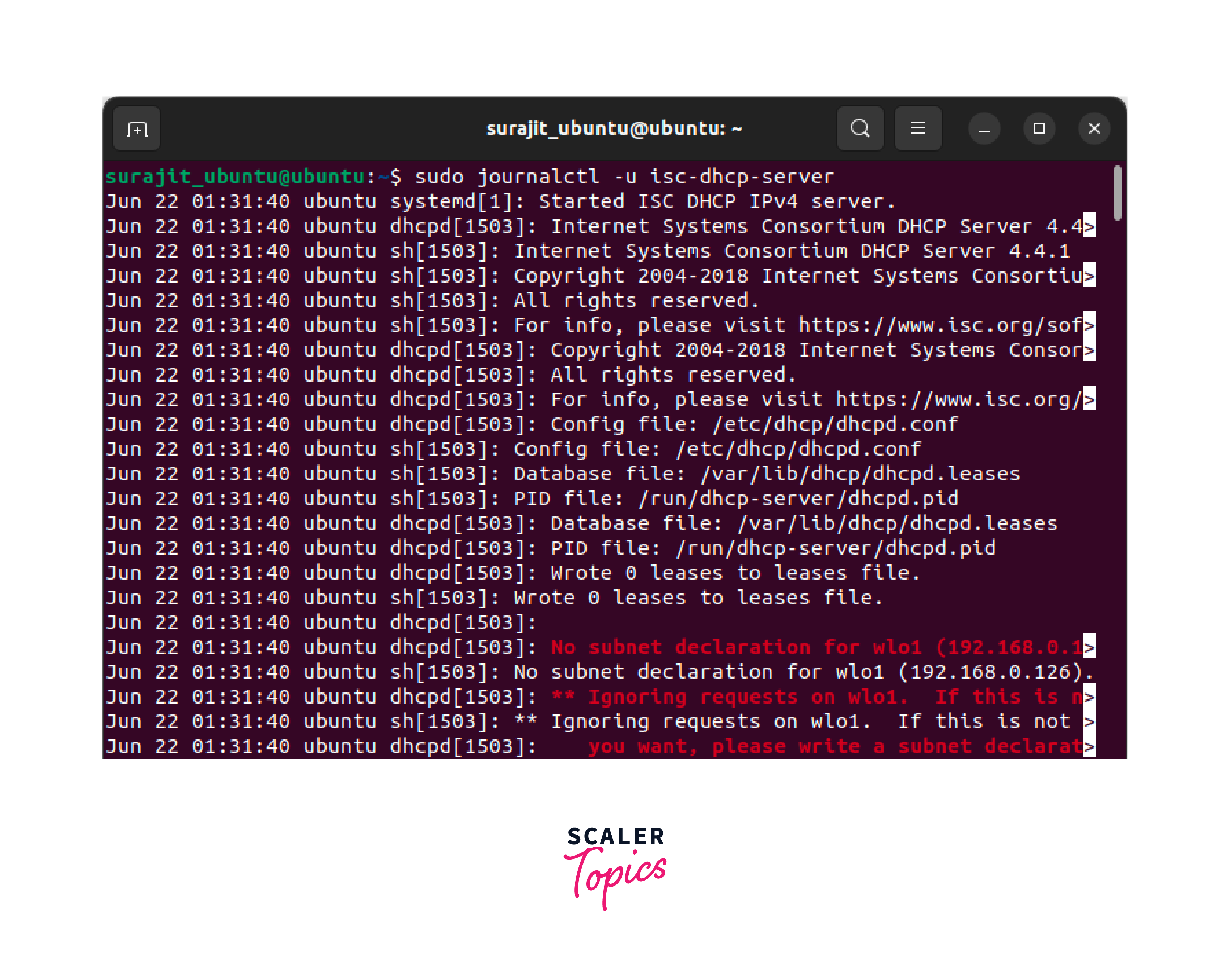 Examine the system logs for any DHCP-related errors or warnings. The logs can provide additional information about the issue. You can view the logs using the journalctl command, such as sudo journalctl -u isc-dhcp-server.