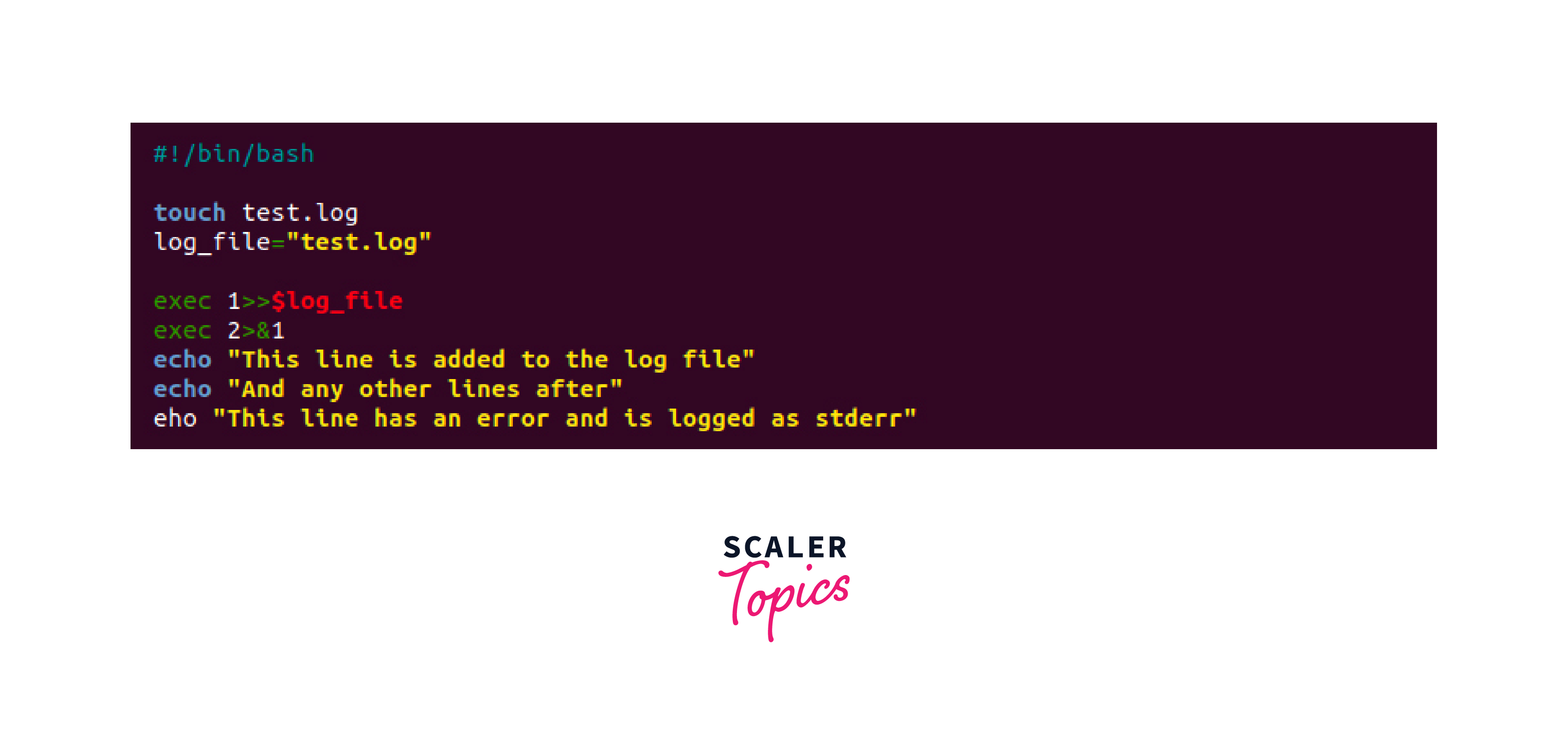 Without explicitly stating the redirection operator and log file name after each echo statement, we may want to redirect the output of all the echo statements into a log file while writing Bash scripts. A potent built-in tool that may be used for this is the bash exec command.